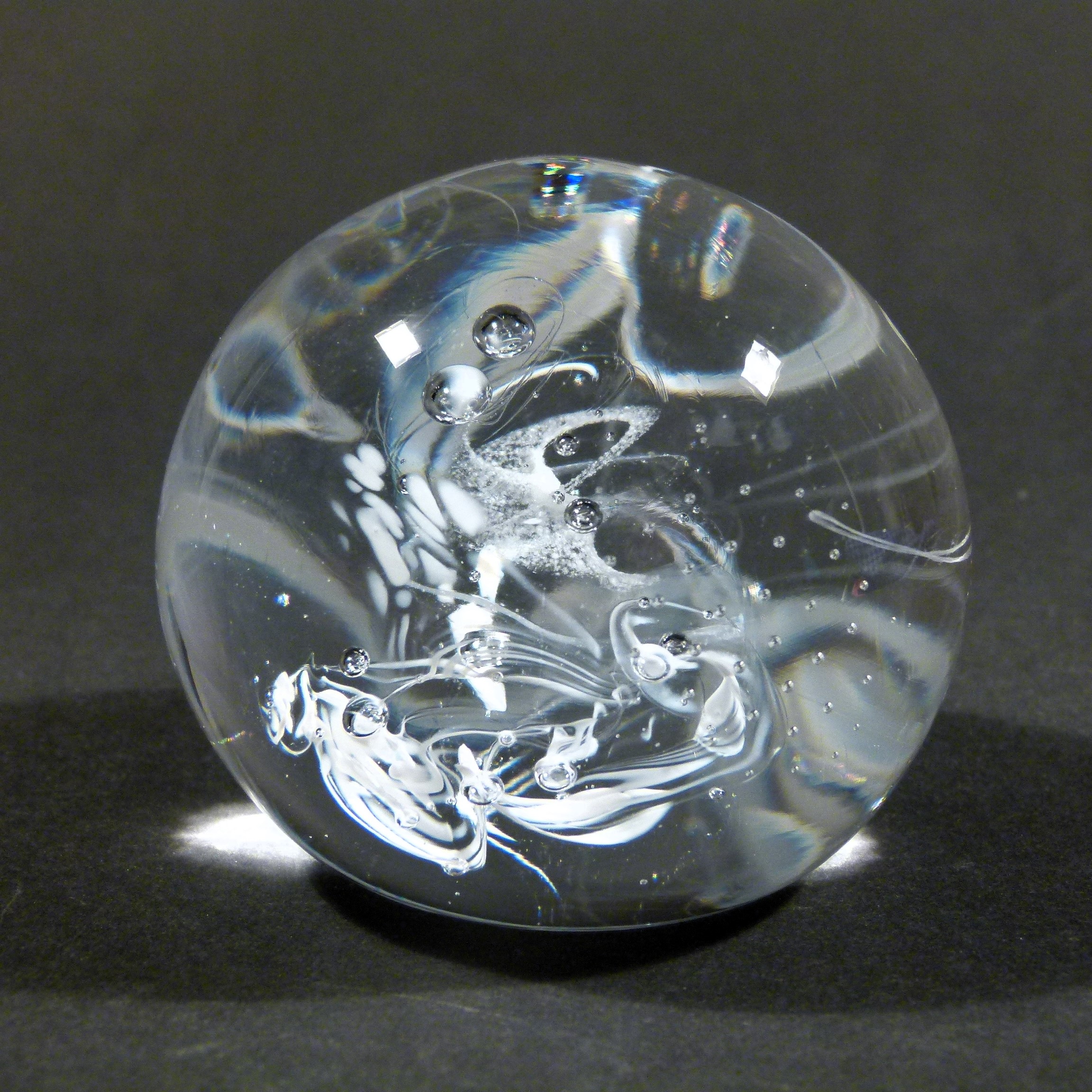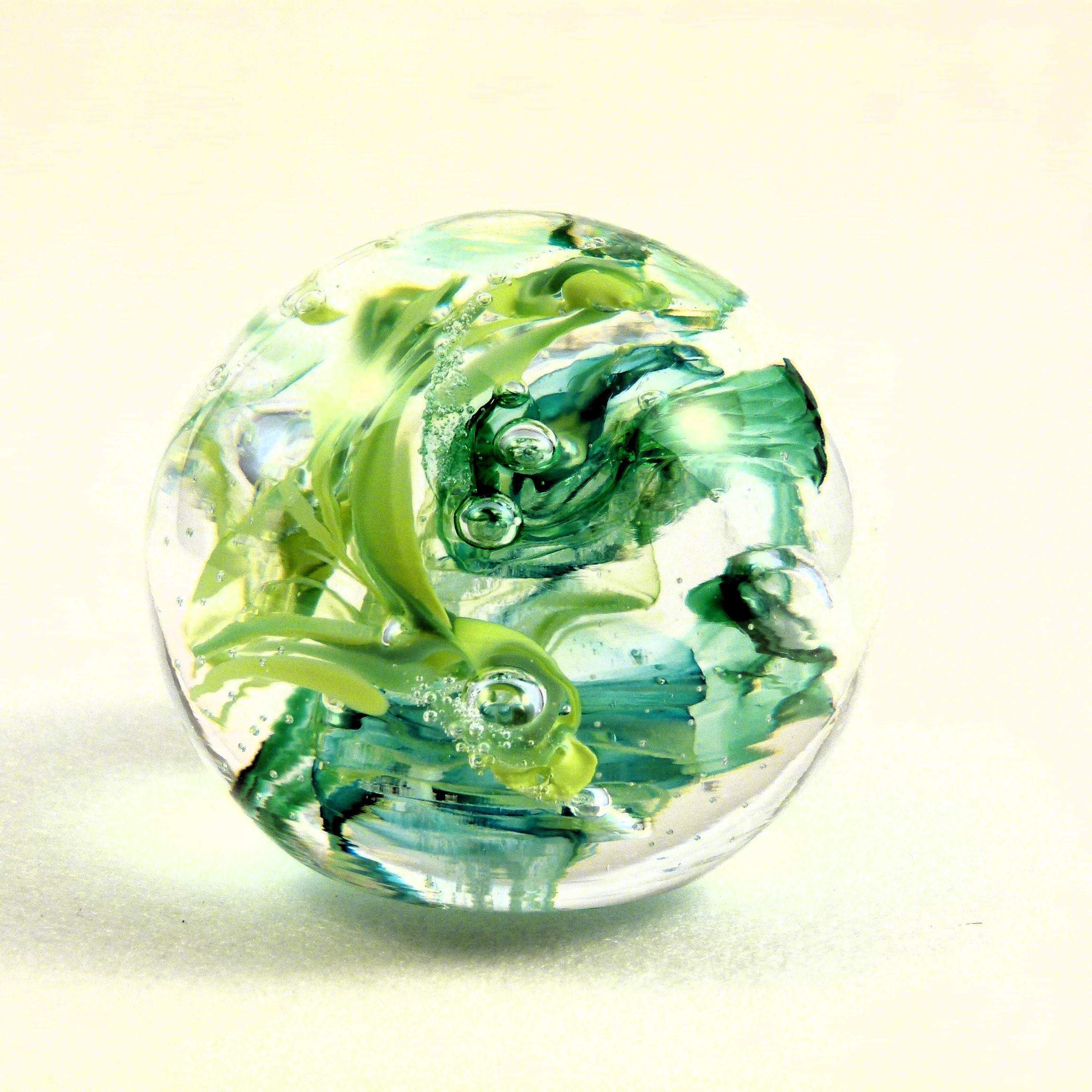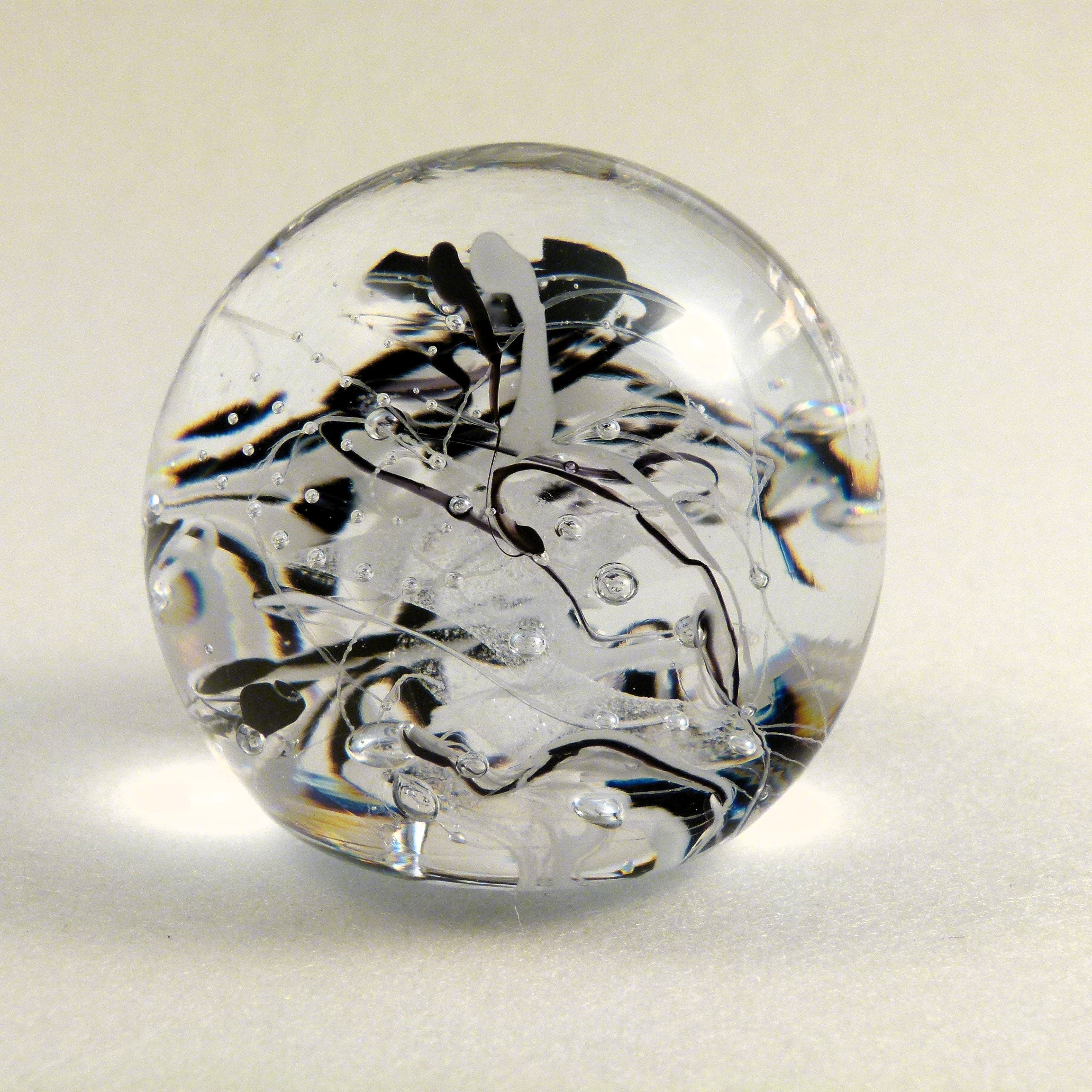 Mal ruhig, mal stürmisch, diese Zauberkugel beherbergt eine Miniaturgalaxie aus Farbglasschleiern, Luftbläschen und delikaten Farbglasfäden.