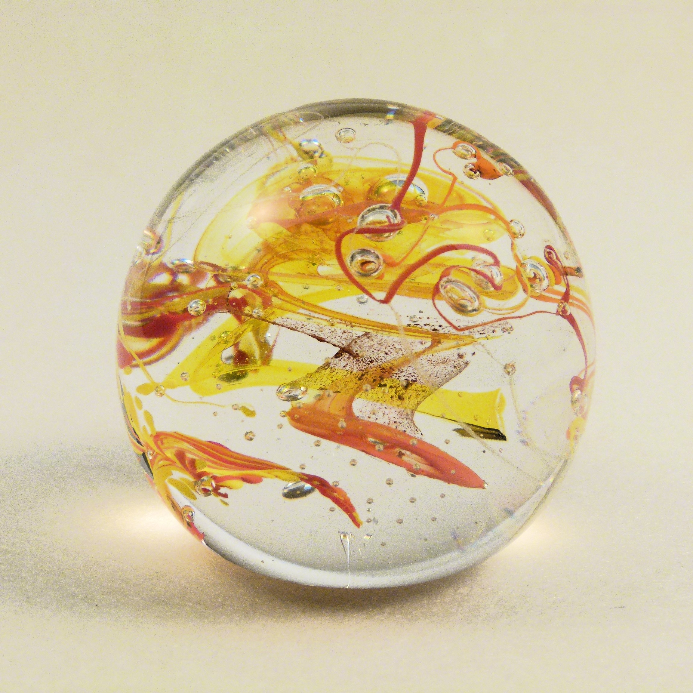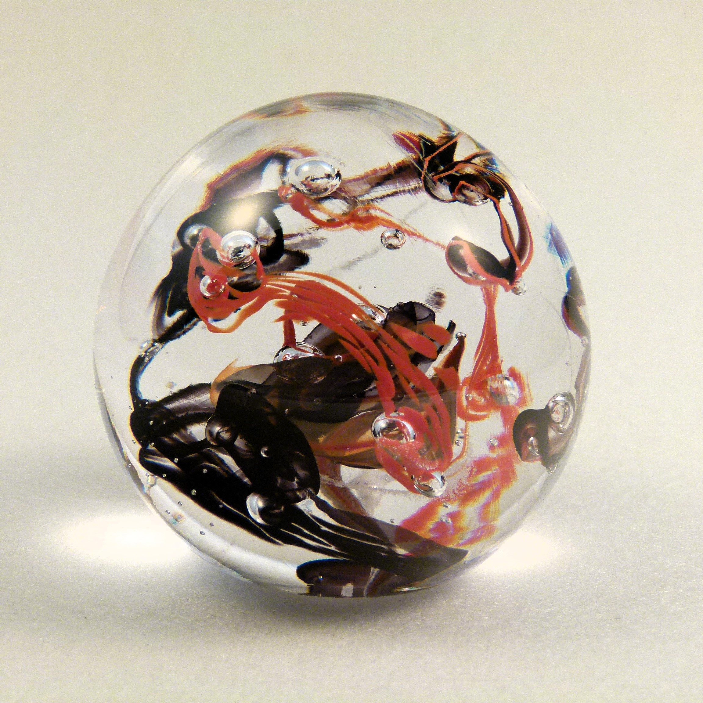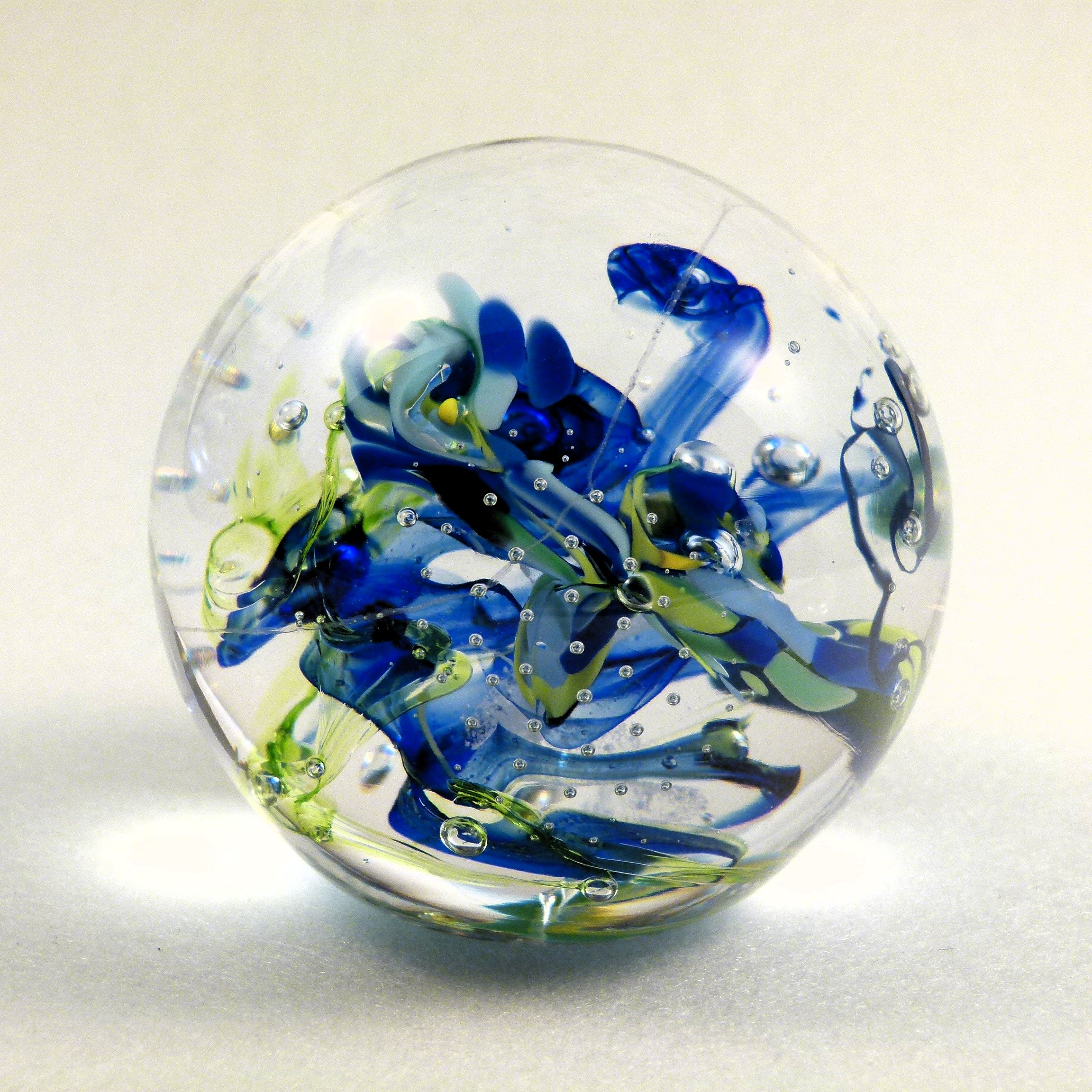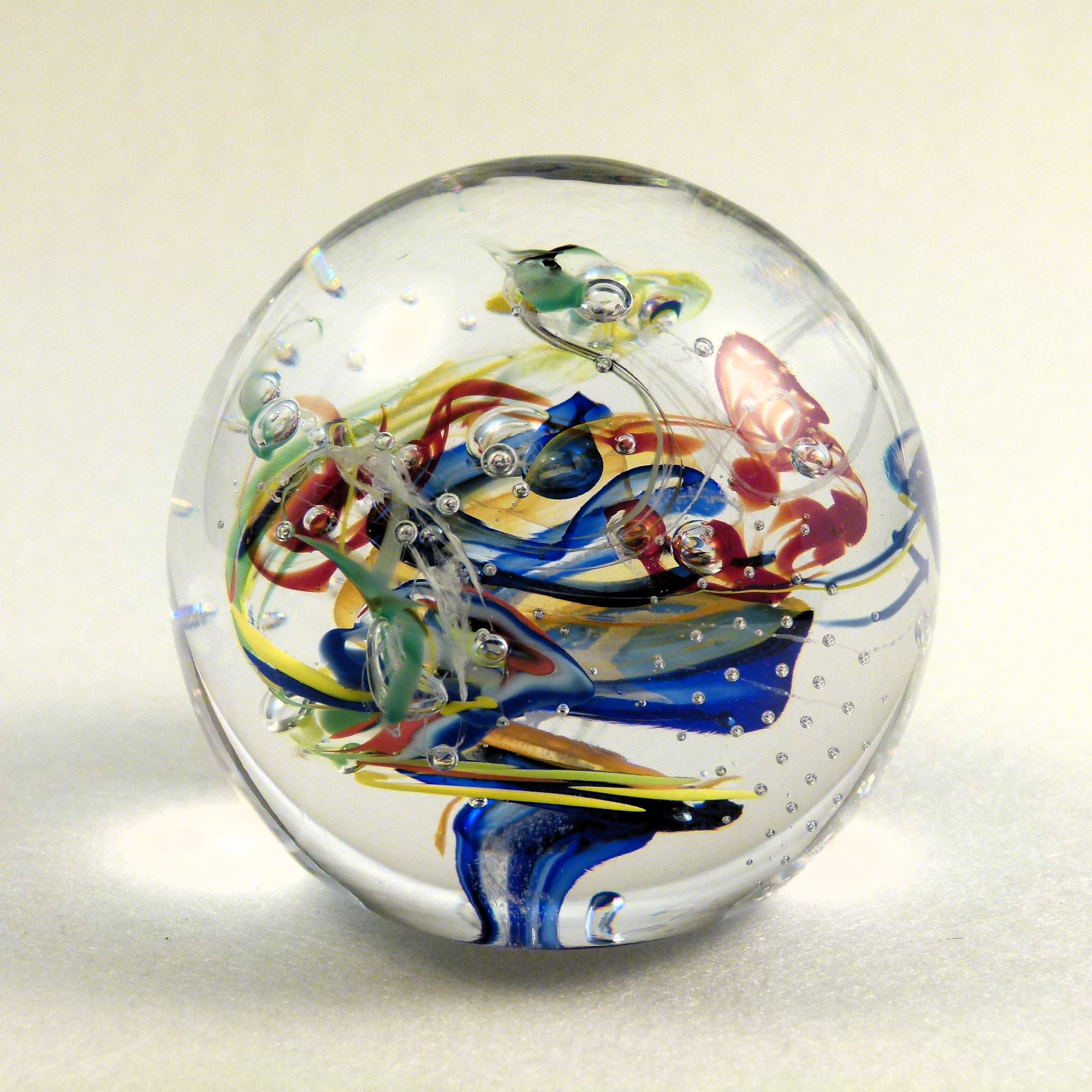 Mal ruhig, mal stürmisch, diese Zauberkugel beherbergt eine Miniaturgalaxie aus Farbglasschleiern, Luftbläschen und delikaten Farbglasfäden.