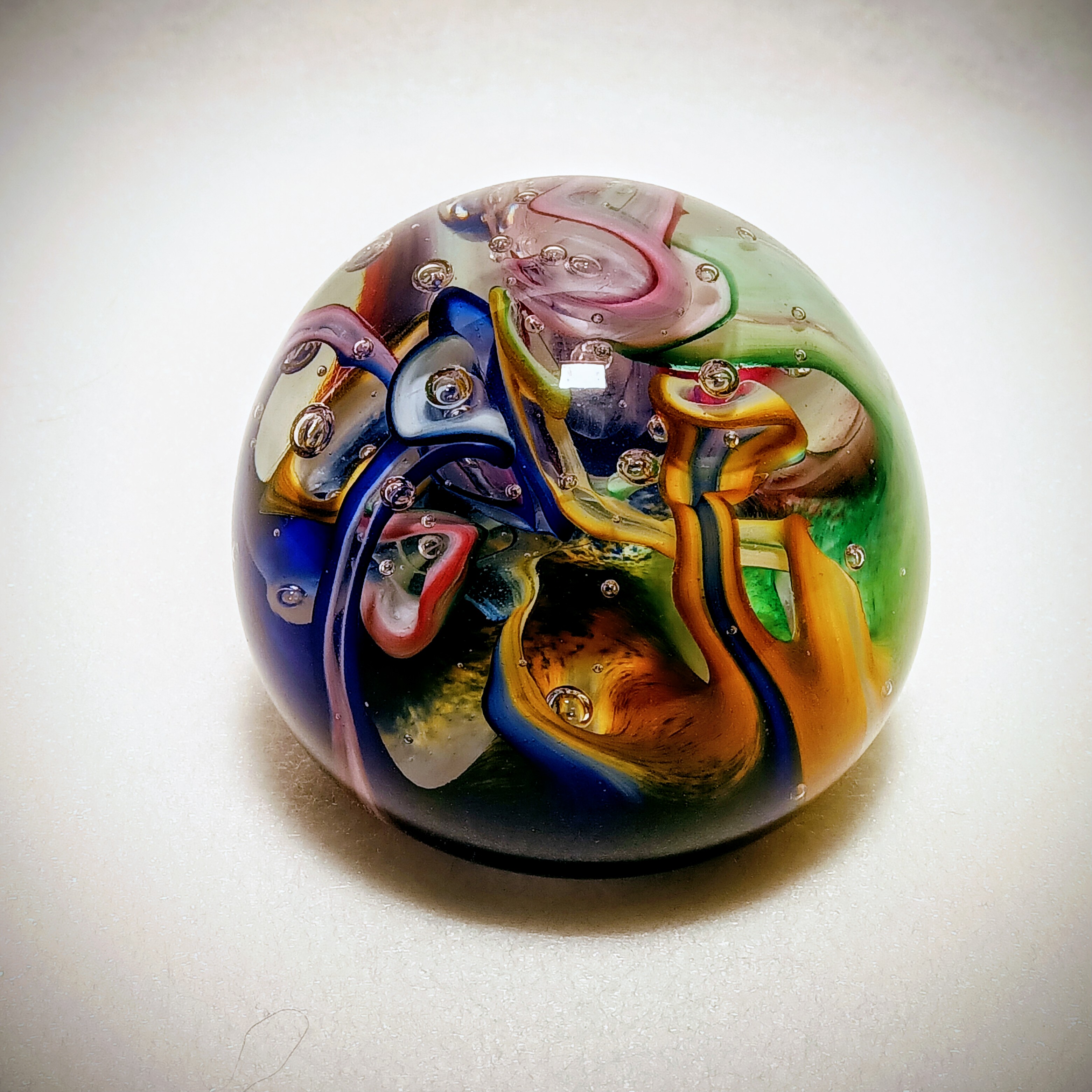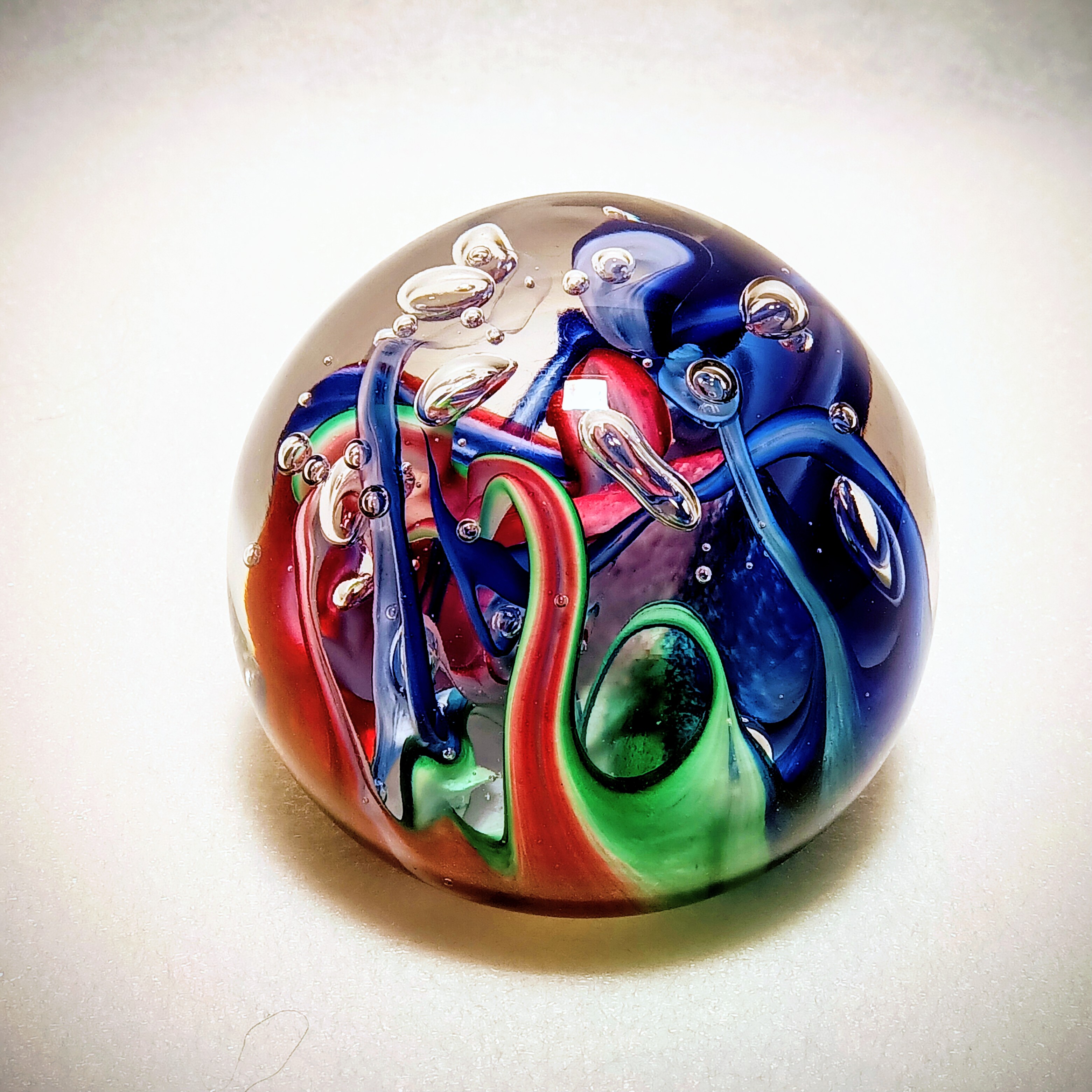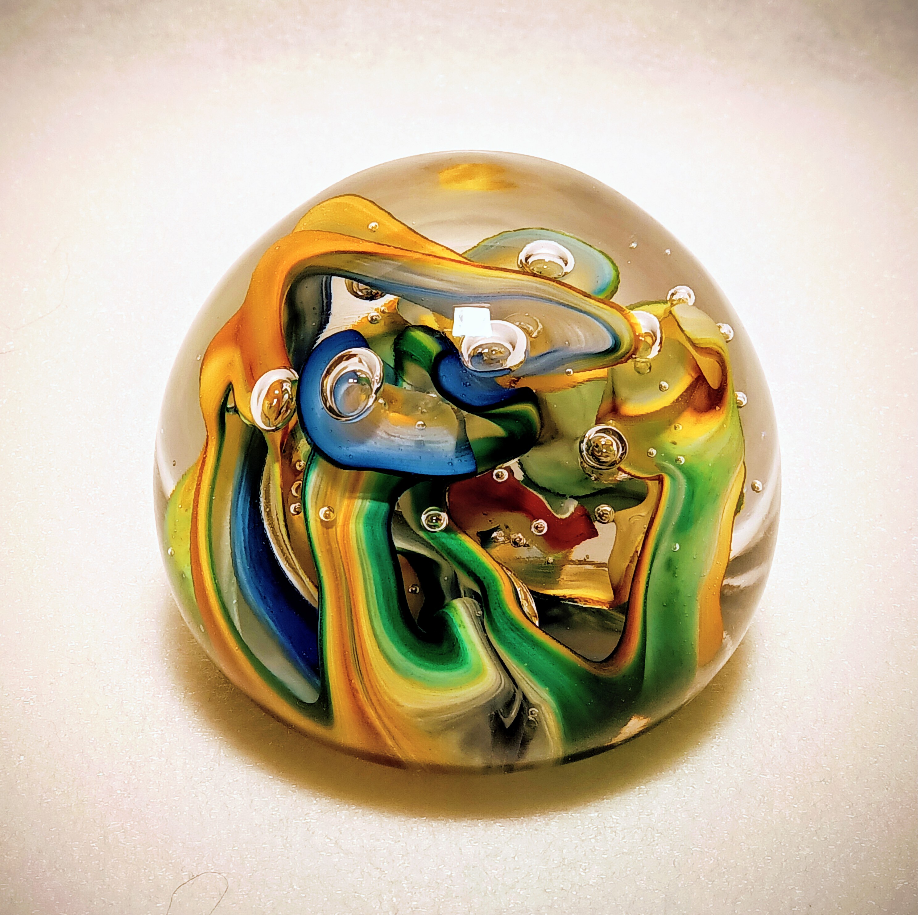 Ein harmonischer Briefbeschwerer mit zartem Innenleben aus Farb- und Klarglas.