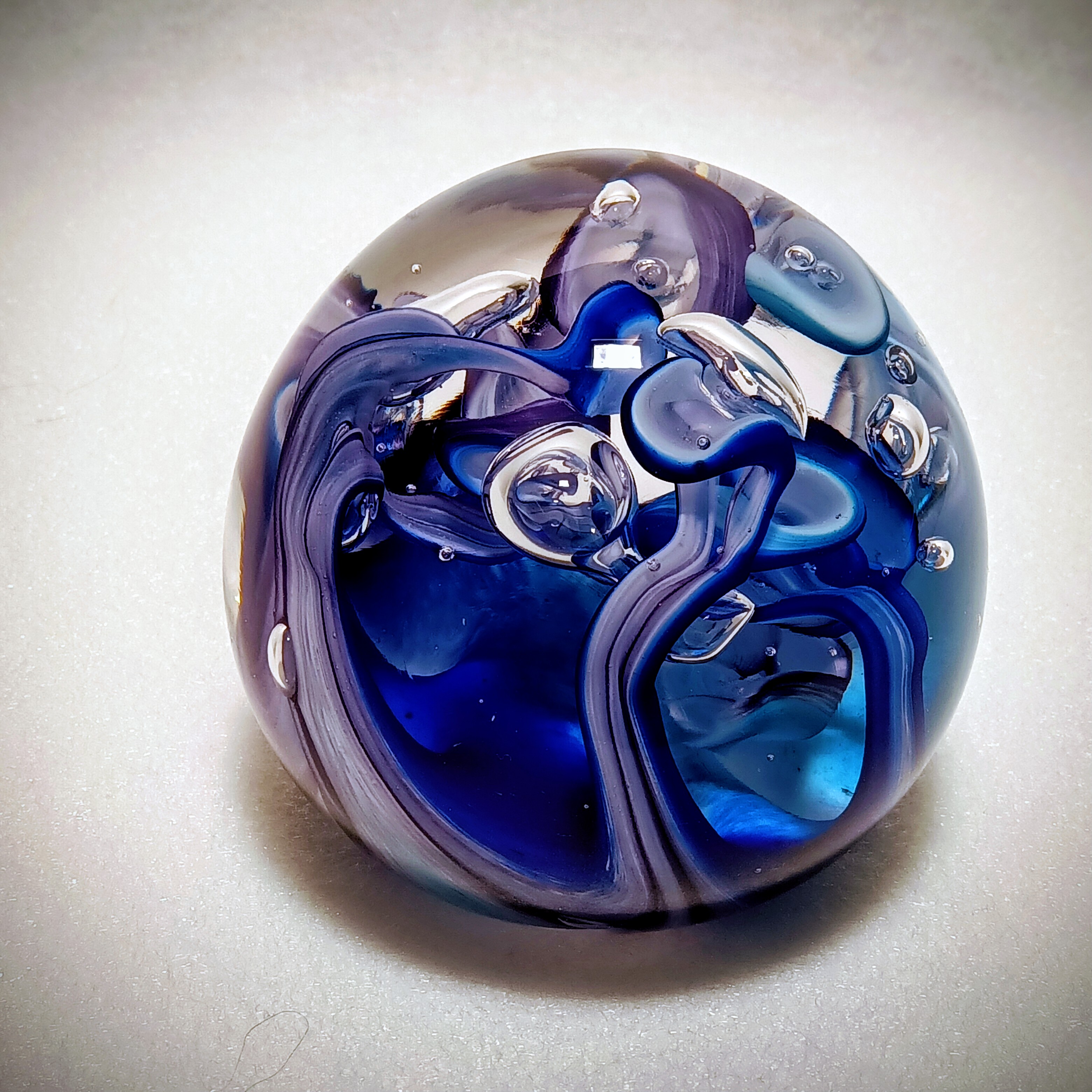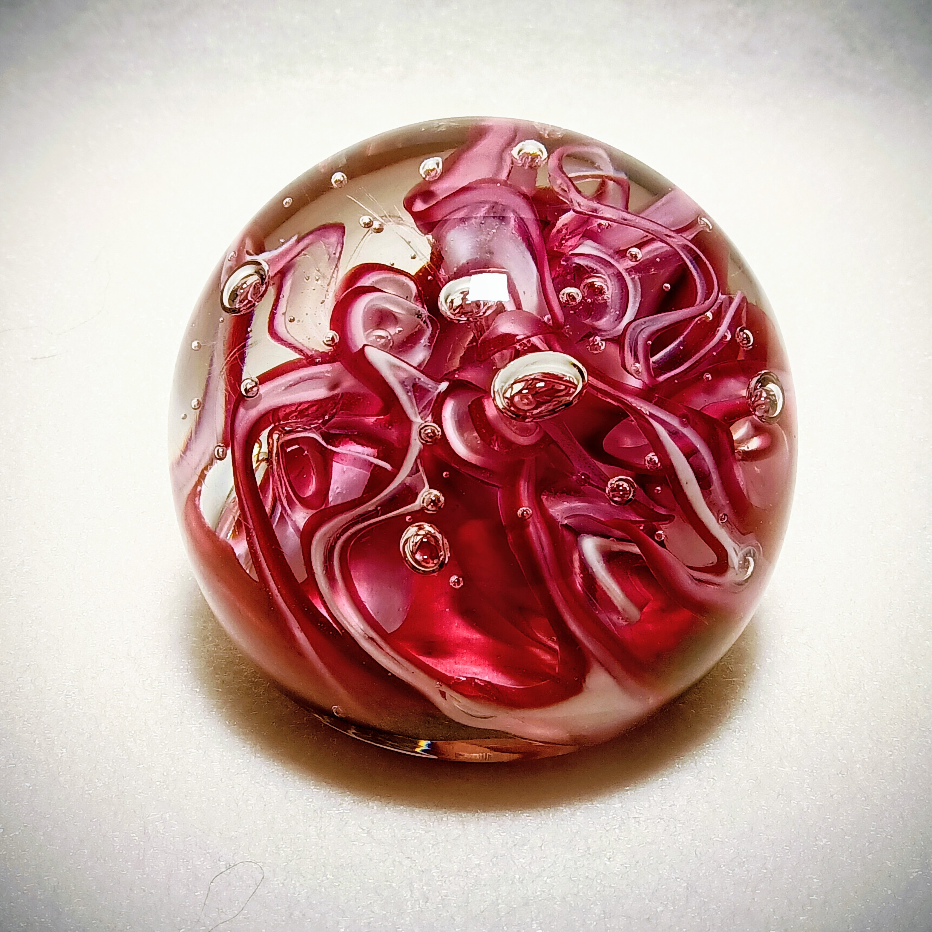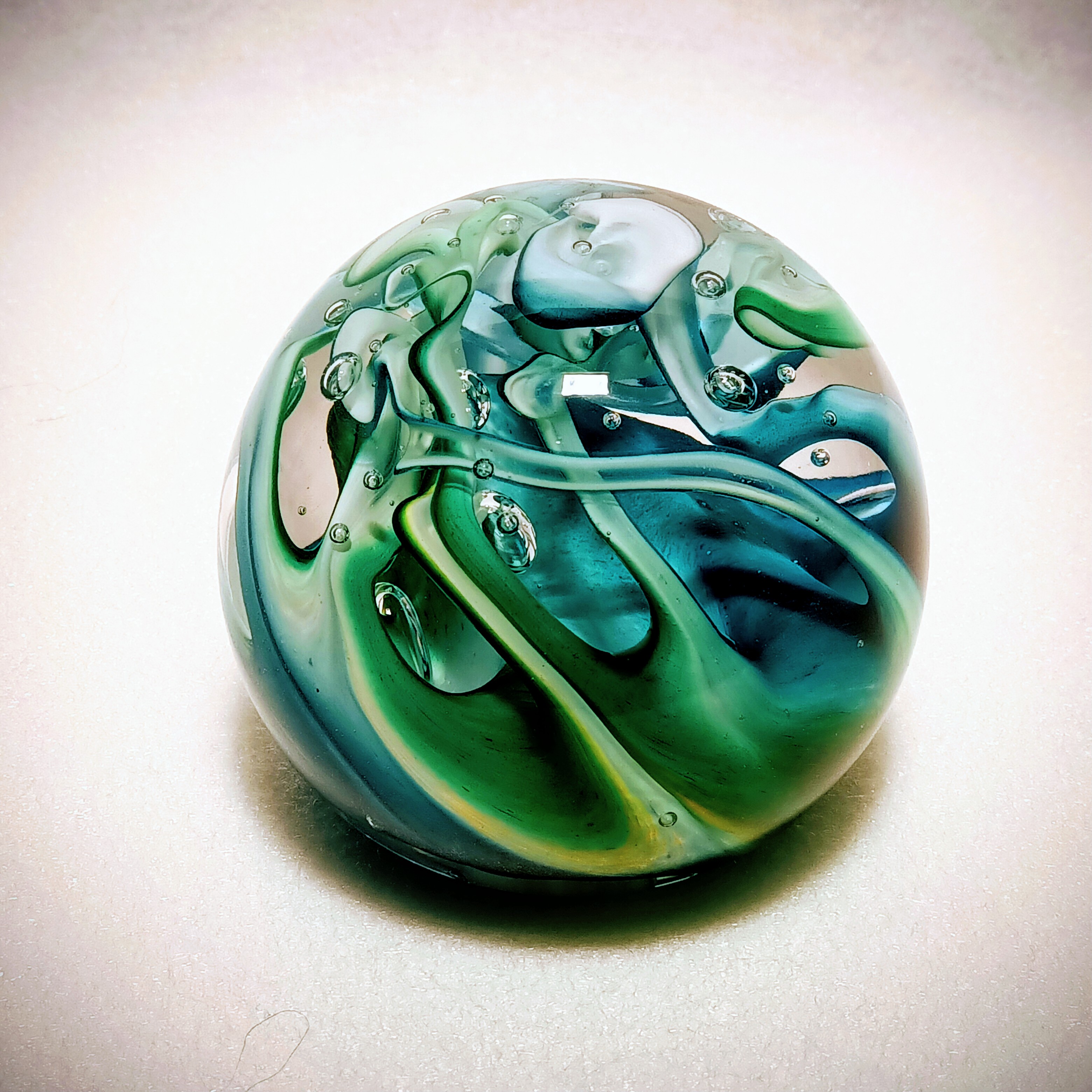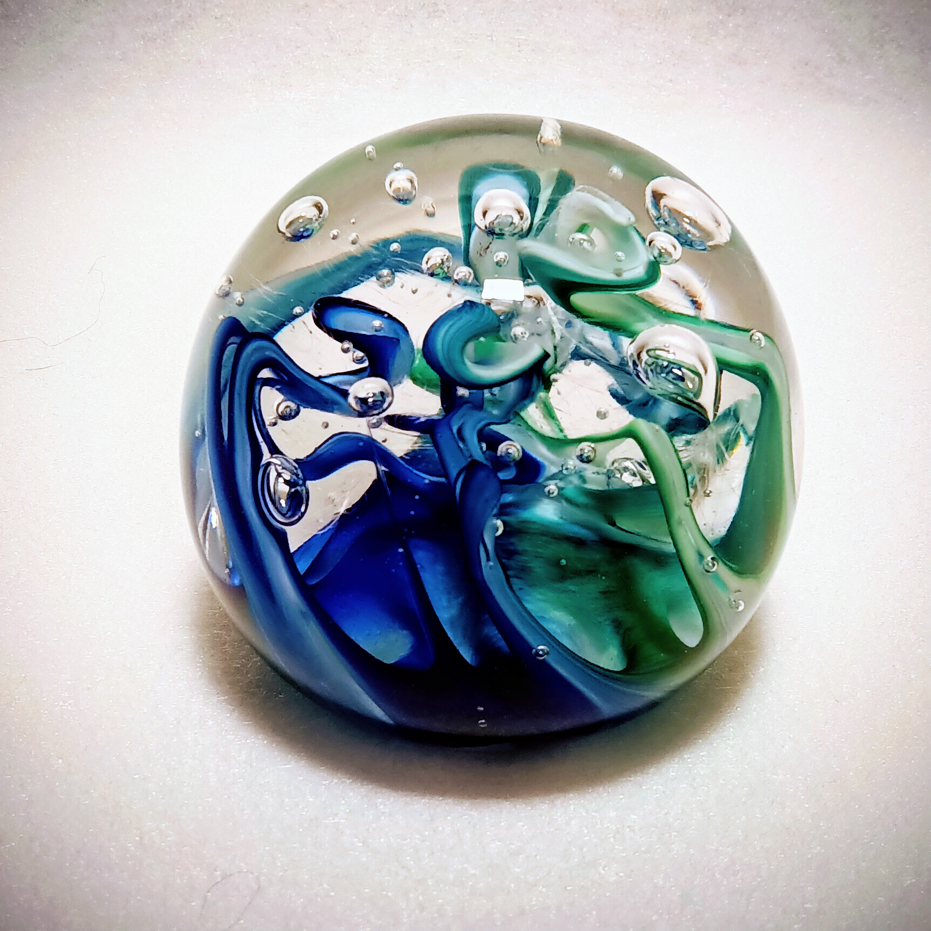 Ein harmonischer Briefbeschwerer mit zartem Innenleben aus Farb- und Klarglas.