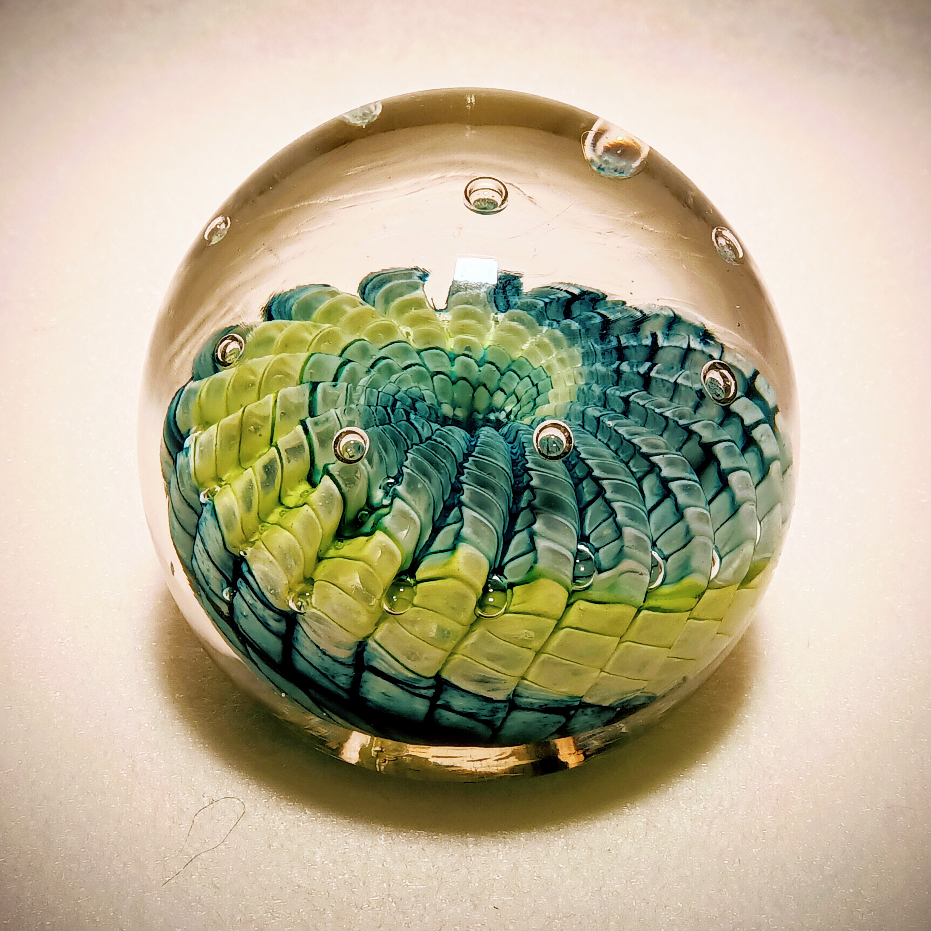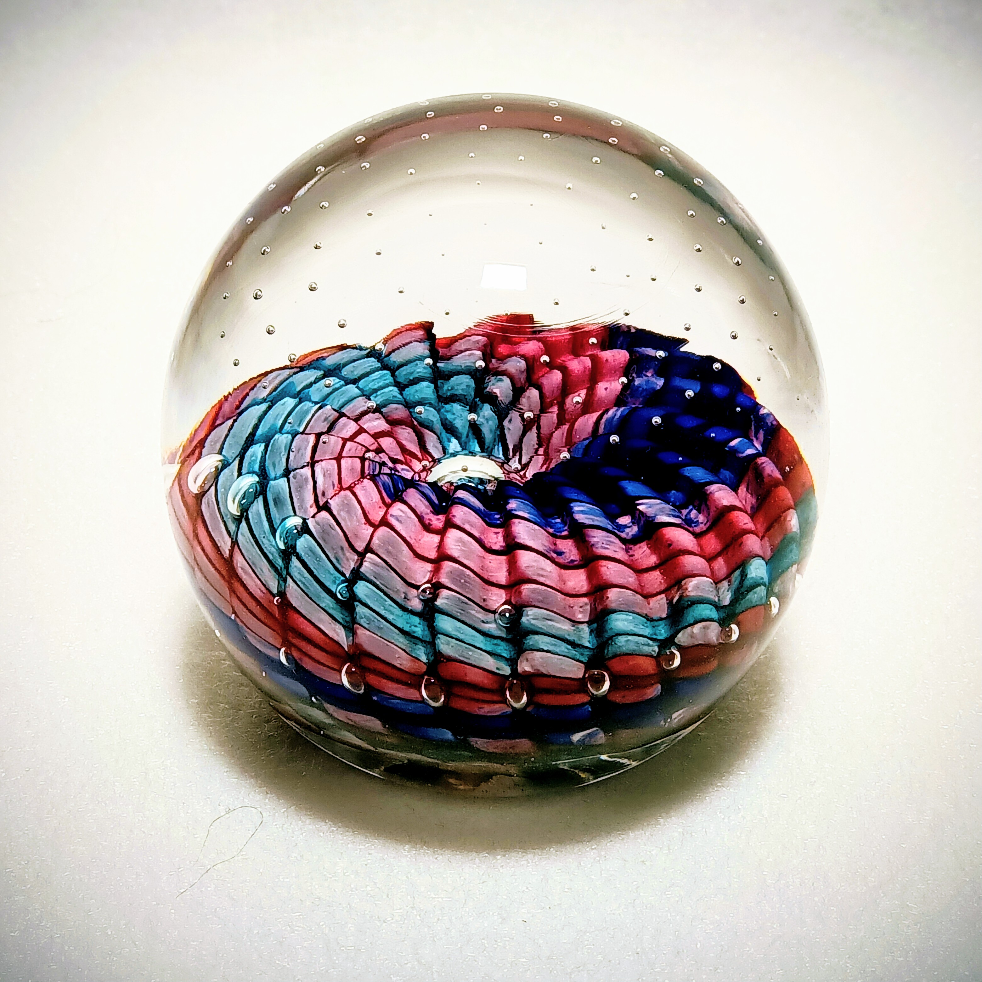 Der Briefbeschwerer mit dem geometrsichen Muster. Durch die Kuppe aus Kristallglas scheint sich das Innenleben zu bewegen. Eine optische Täuschung, die nicht nur Kinder fasziniert!