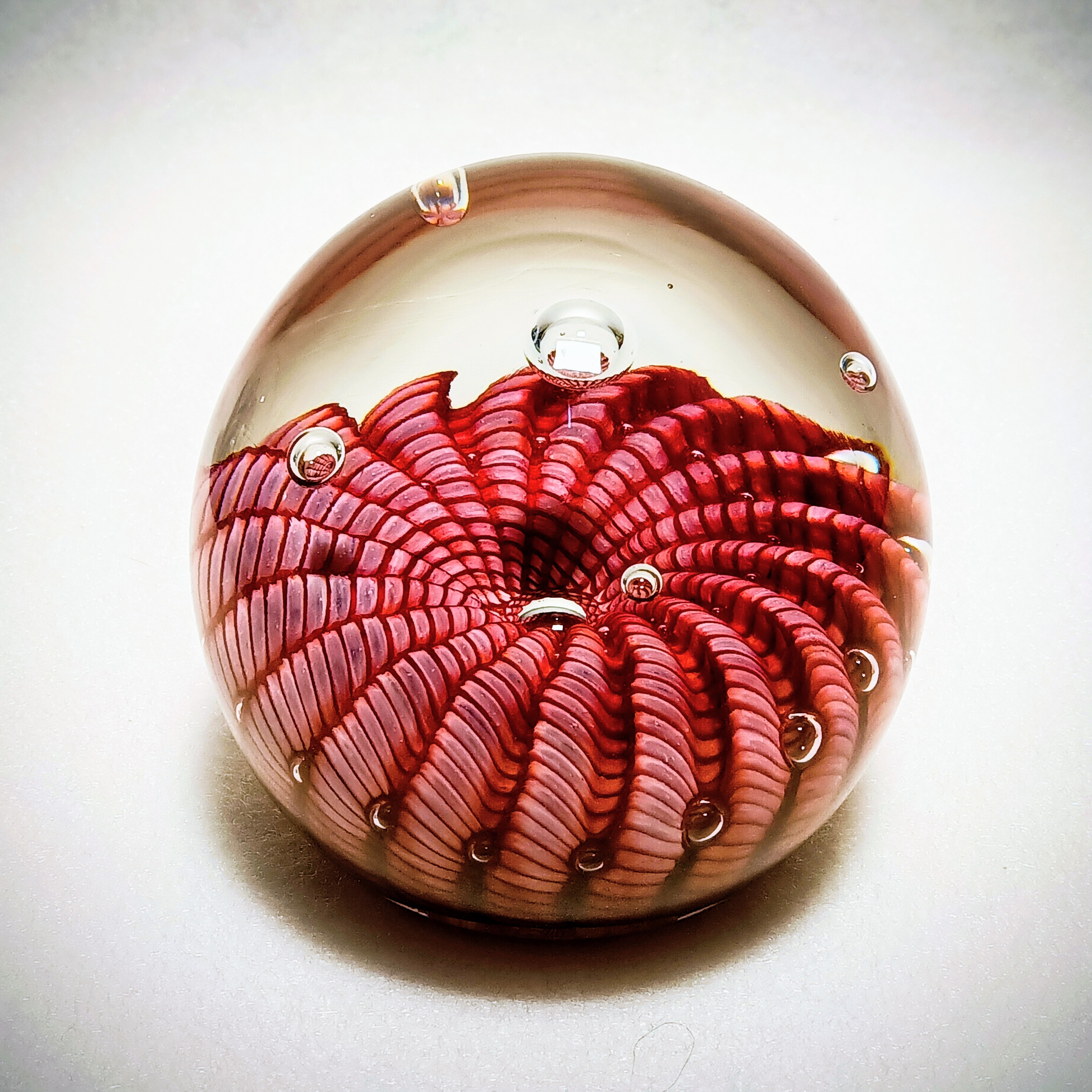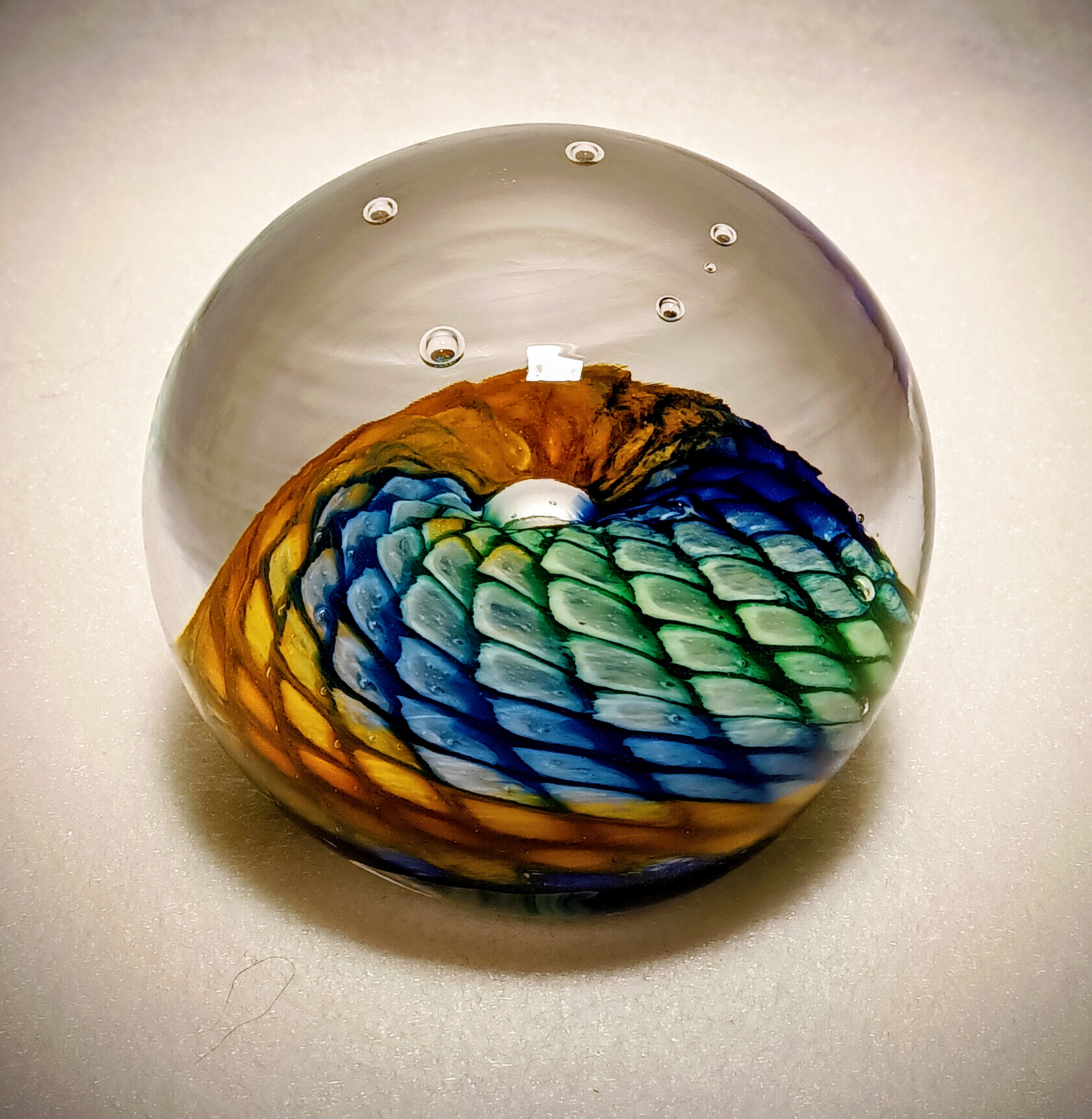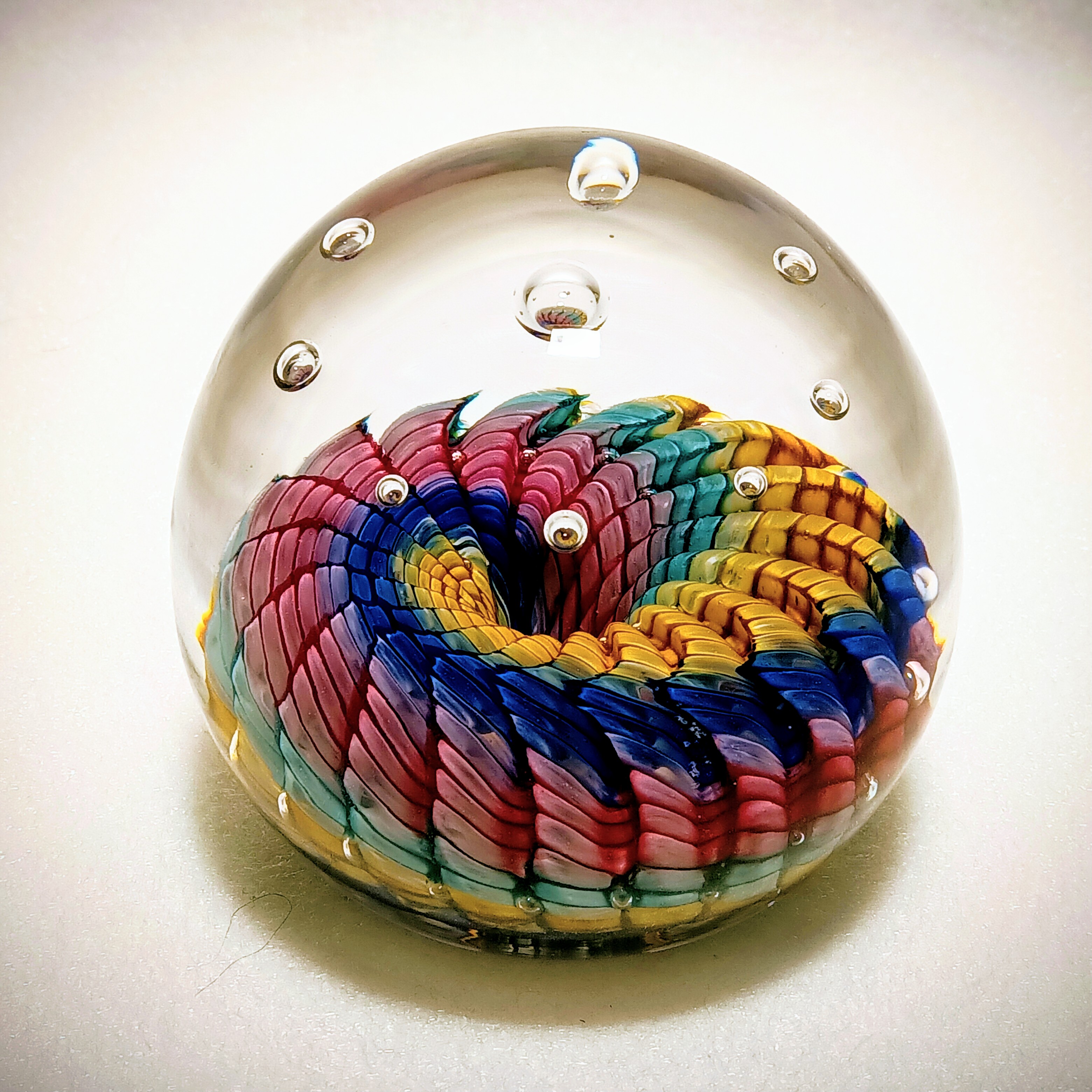 Die Standfläche ist unten abgeflacht. Der sogenannte Nabel (Punkt an dem das Paperweight an der Glasmacherpfeife befestigt war) ist eingeschmolzen.