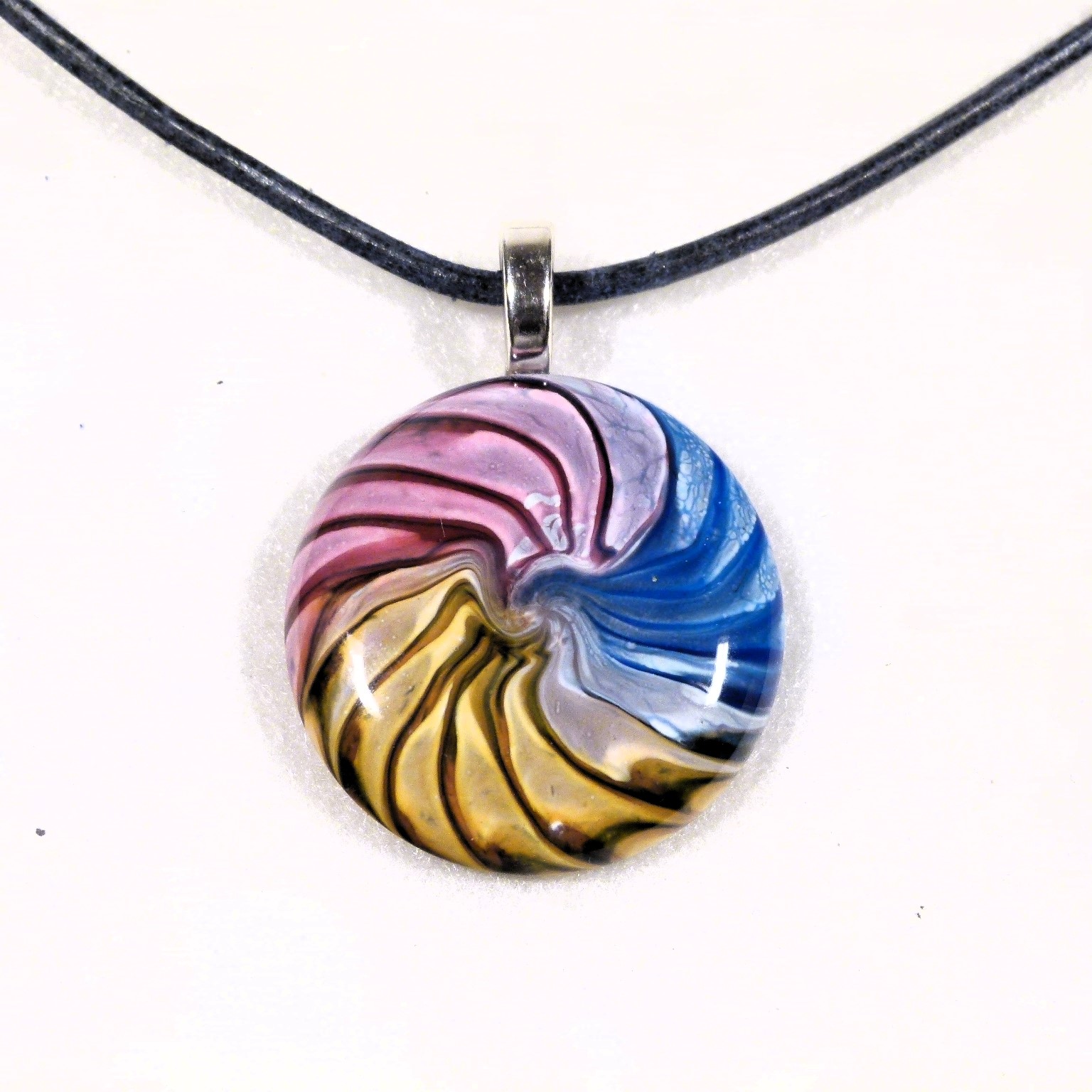 Dieser handgefertigte Anhänger aus farbigem Glas kommt mit schwarzem Lederband in 42 cm, es hat einen Karabinerverschluss aus Metall.