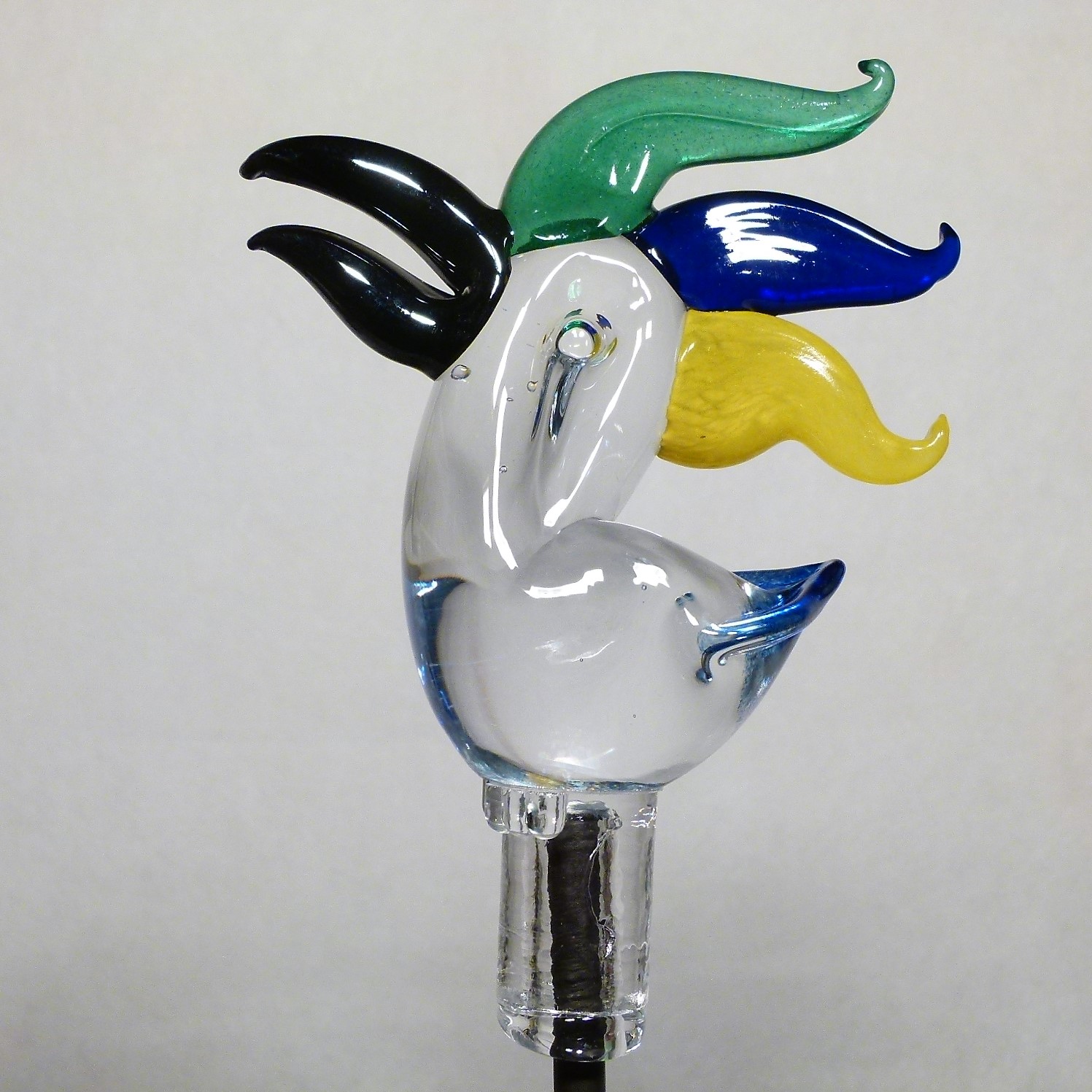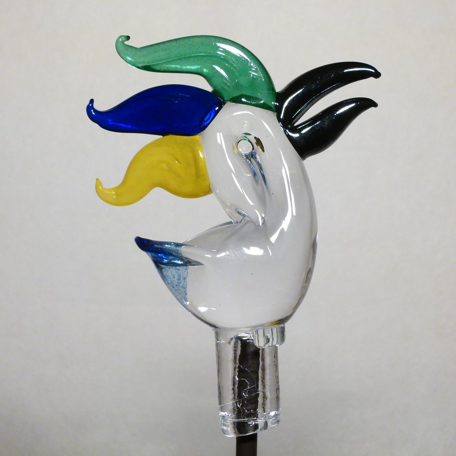 Er hat einen Körper aus freigeformtem, massivem Klarglas und ein blaues Schwänzchen. Der Schnabel ist schwarz glänzend, der dreifarbige Glaskamm ist aus Farbglas.
