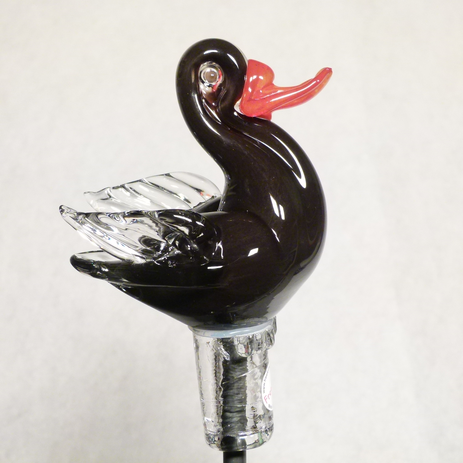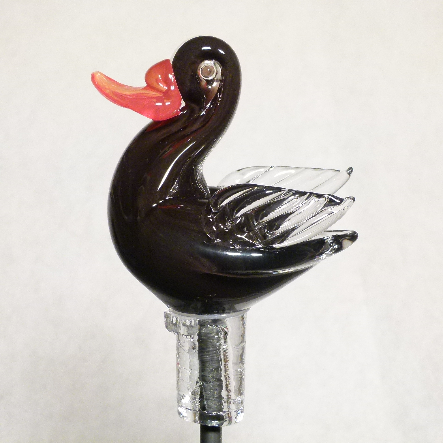 Wir haben als kontrastreiches Pendant zu dem Höcherschan einen ‘Cygnus atratus’ oder Schwarzschwan bzw. Trauerschwan in Glas kreiert. Er ist tief schwarz mit knallrotem Schnabel.