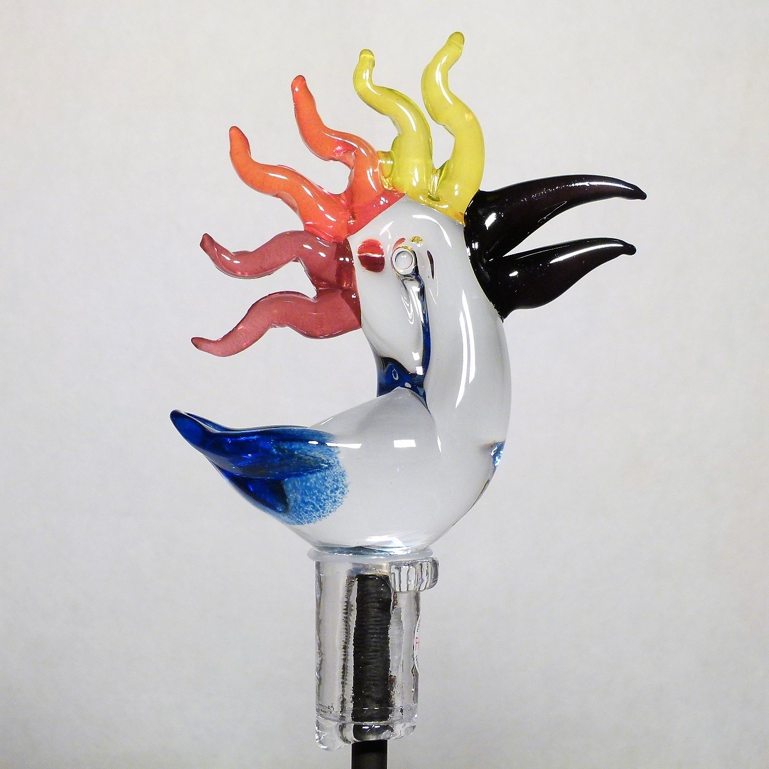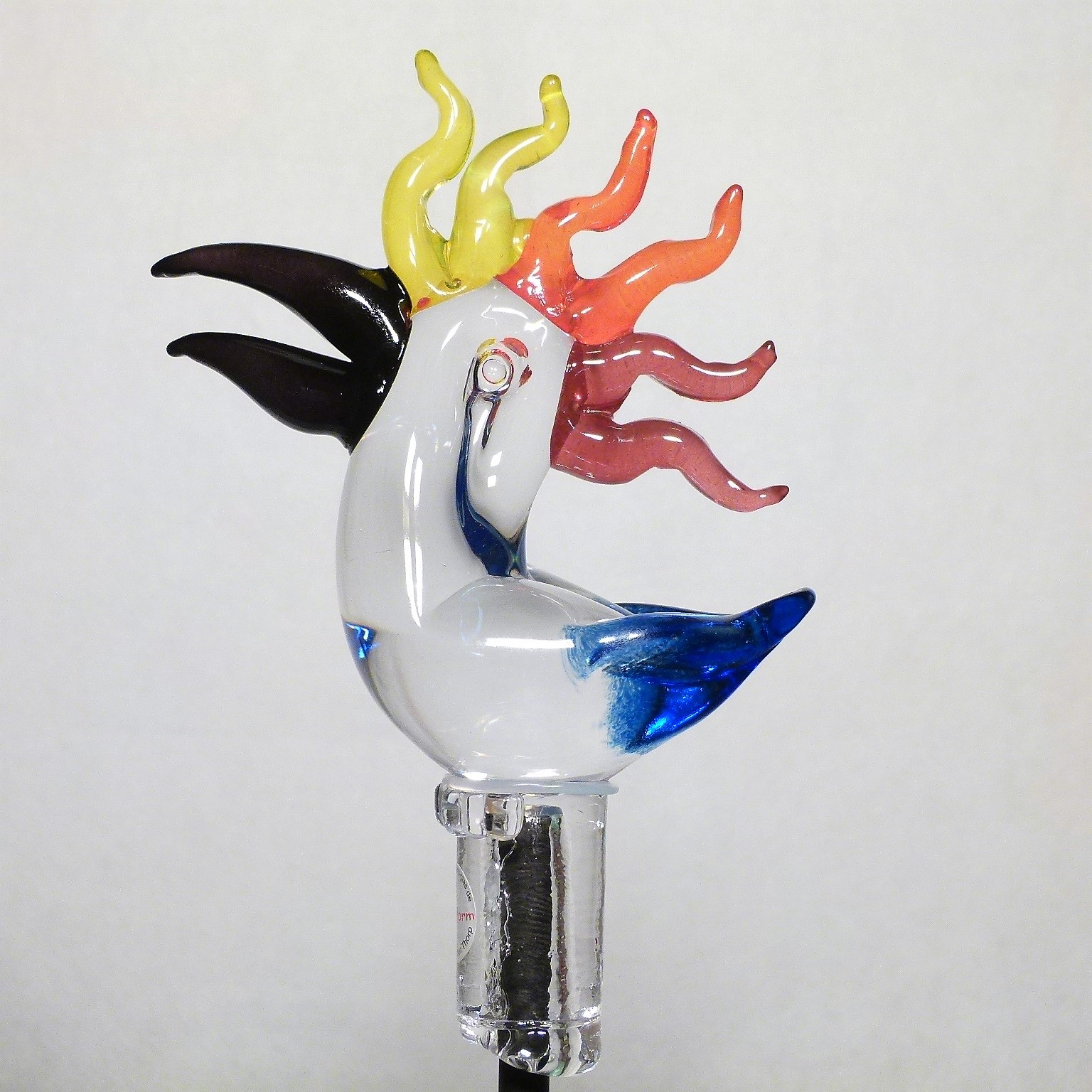 Er hat einen Körper aus freigeformtem, massivem Klarglas und ein blaues Schwänzchen. Der Schnabel ist schwarz glänzend, sein wunderschöner Kamm leuchtet in rot, orange und brilliantgelb.