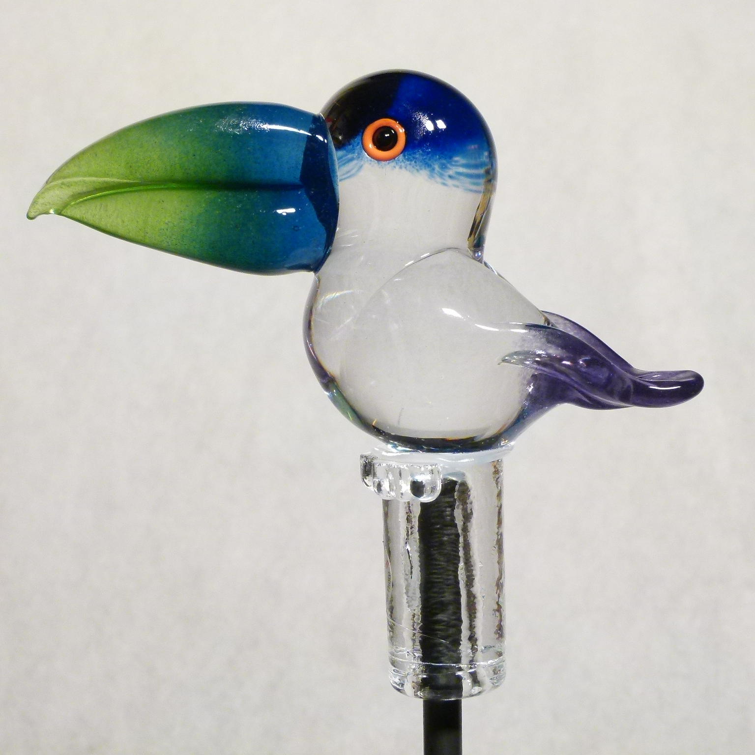 Er hat einen Körper aus freigeformtem, massivem Klarglas und ein blaues Schwänzchen. Sein Schnabel ist blau und grün. Die schwarzen Augen sind mit blau und orange hinterlegt.