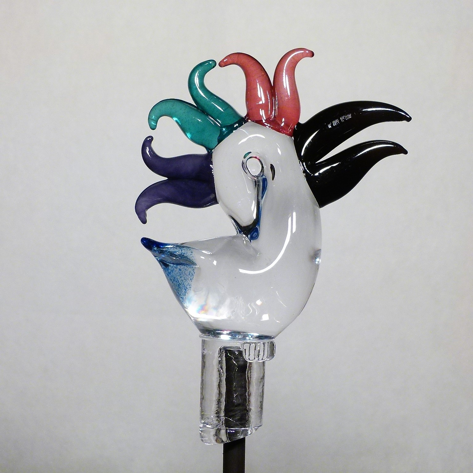 Er hat einen Körper aus freigeformtem, massivem Klarglas und ein blaues Schwänzchen. Der Schnabel ist schwarz glänzend, sein aufwendig aus Farbglas gestalteter Kopfschmuck zeichnet ihn aus.