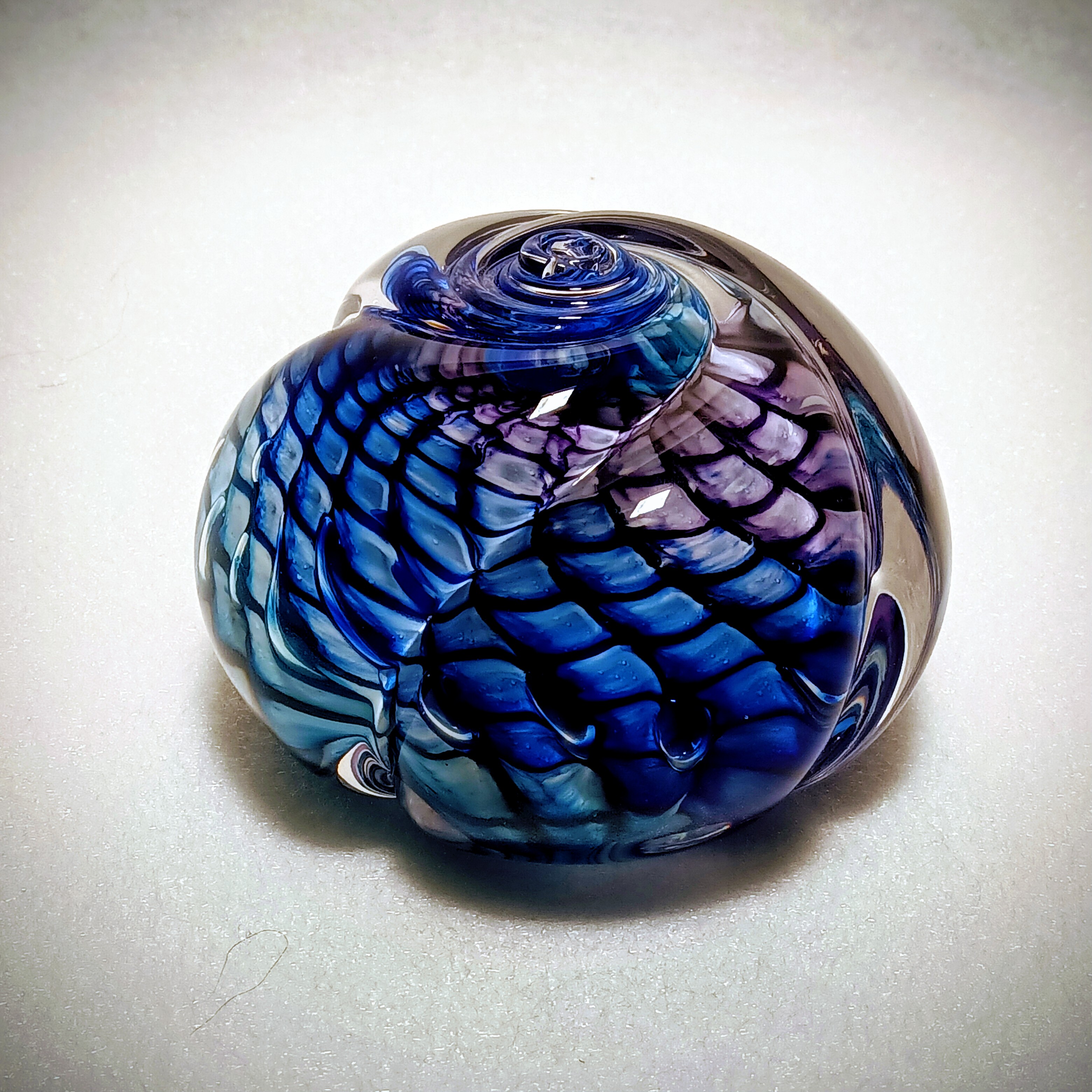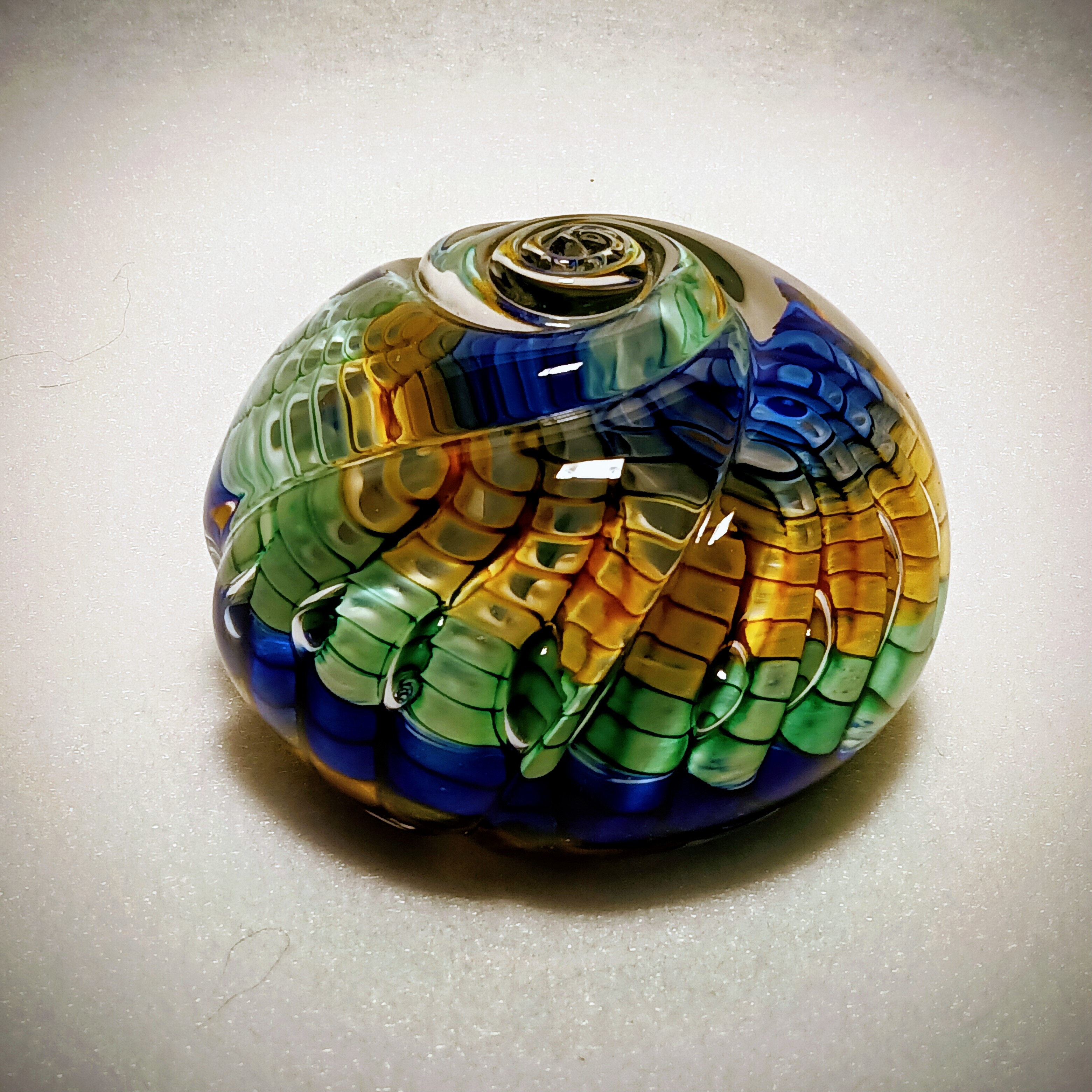 Der sogenannte Nabel (Punkt an dem das Paperweight an der Glasmacherpfeife befestigt war) ist eingeschmolzen.
