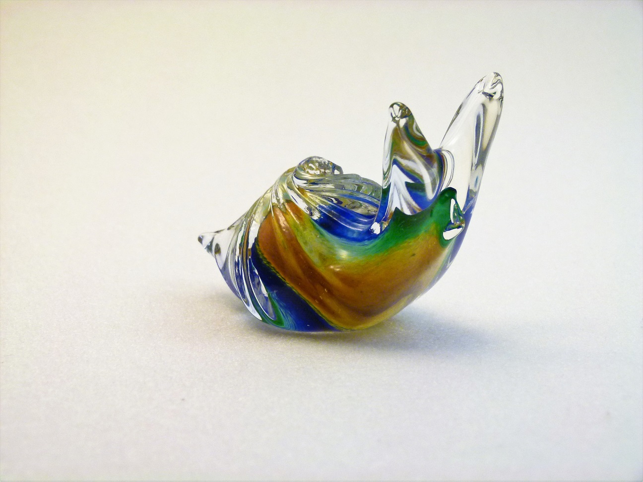 Freihand geformt aus massivem Kristallglas mit Farbglas. Buntes Farbenspiel im Inneren und strukturiertes Schneckenhaus.