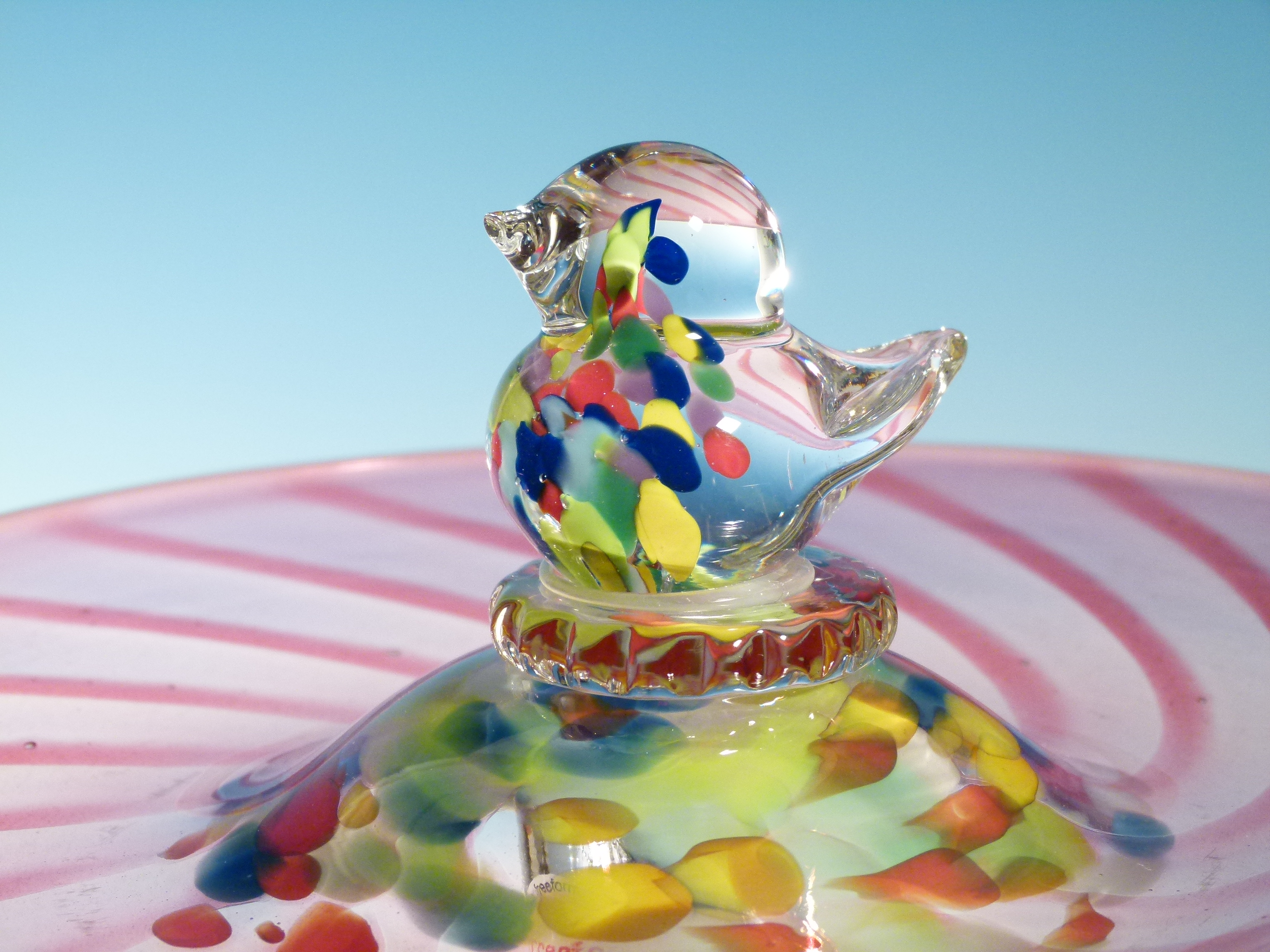Vogeltränke aus Kristallglas mit rotem Rand und bunten Frabglaskröseln in der Mitte, ein dekoratives Glas-Vögelchen sitzt im Zentrum.