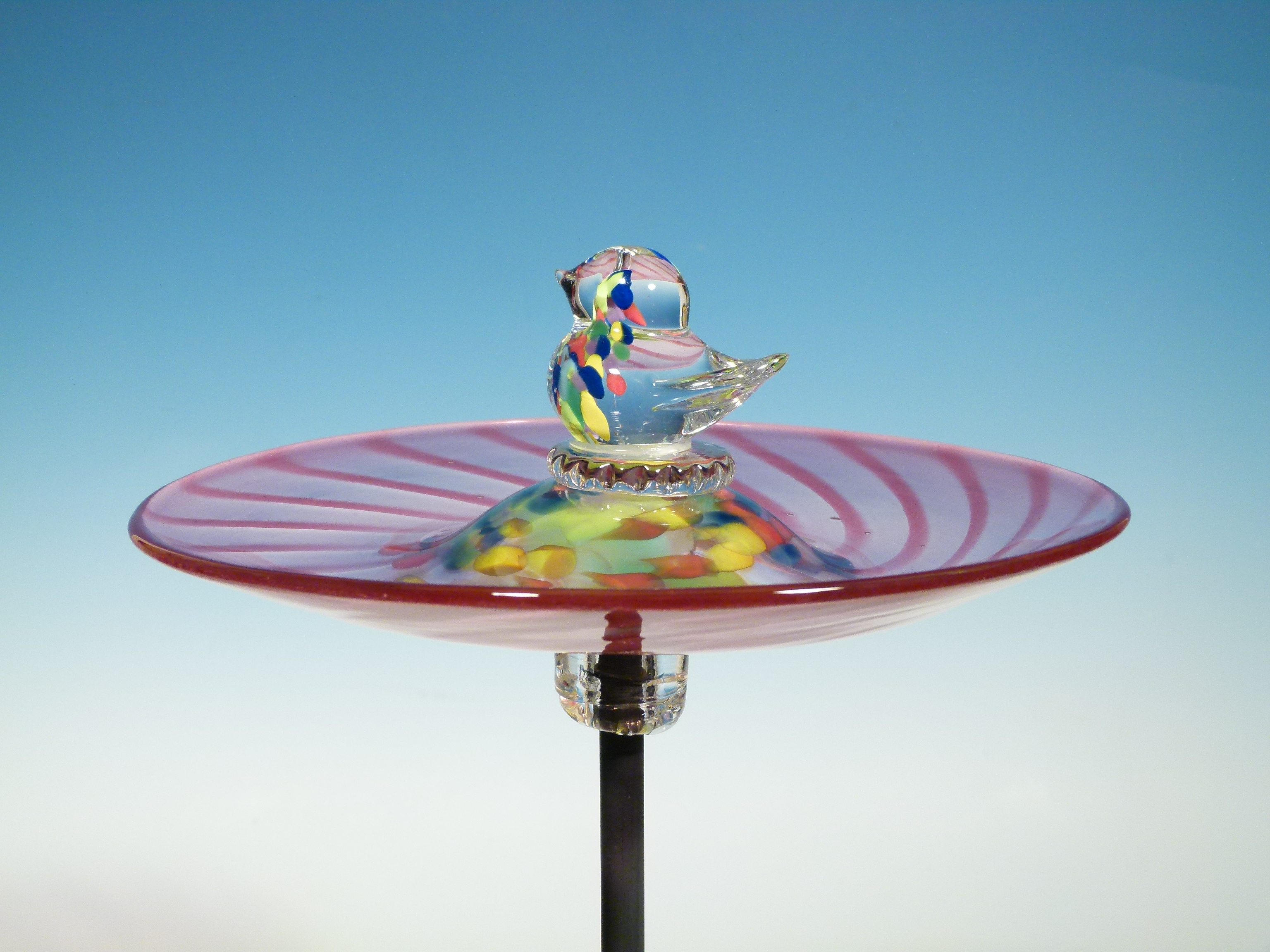 Das Spa Erlebnis für Ihre gefiederten Freunde, hier können die Tiere trinken und baden. Mit unserer mundgeblasenen und formschönen Vogeltränke können Sie die Vögel in Ihren Garten oder auf Ihren Balkon einladen und so beobachten. Mit einem freigeformten Glasvogel in der Mitte, passend zur Tränkenfarbe, sind sie ein dekorativer Akzent für Ihren Garten. Auch Insekten holen sich gern ein Schluck Wasser!