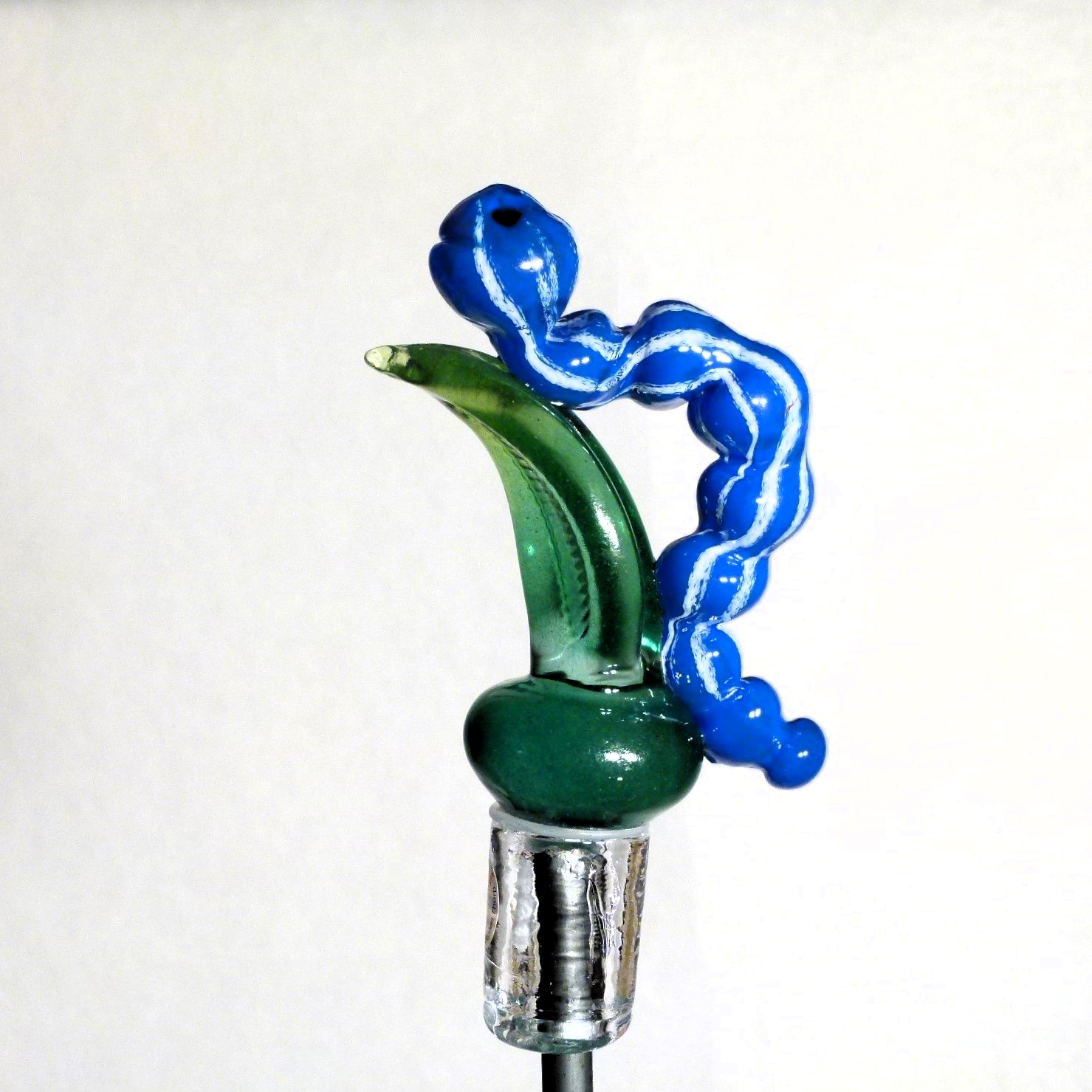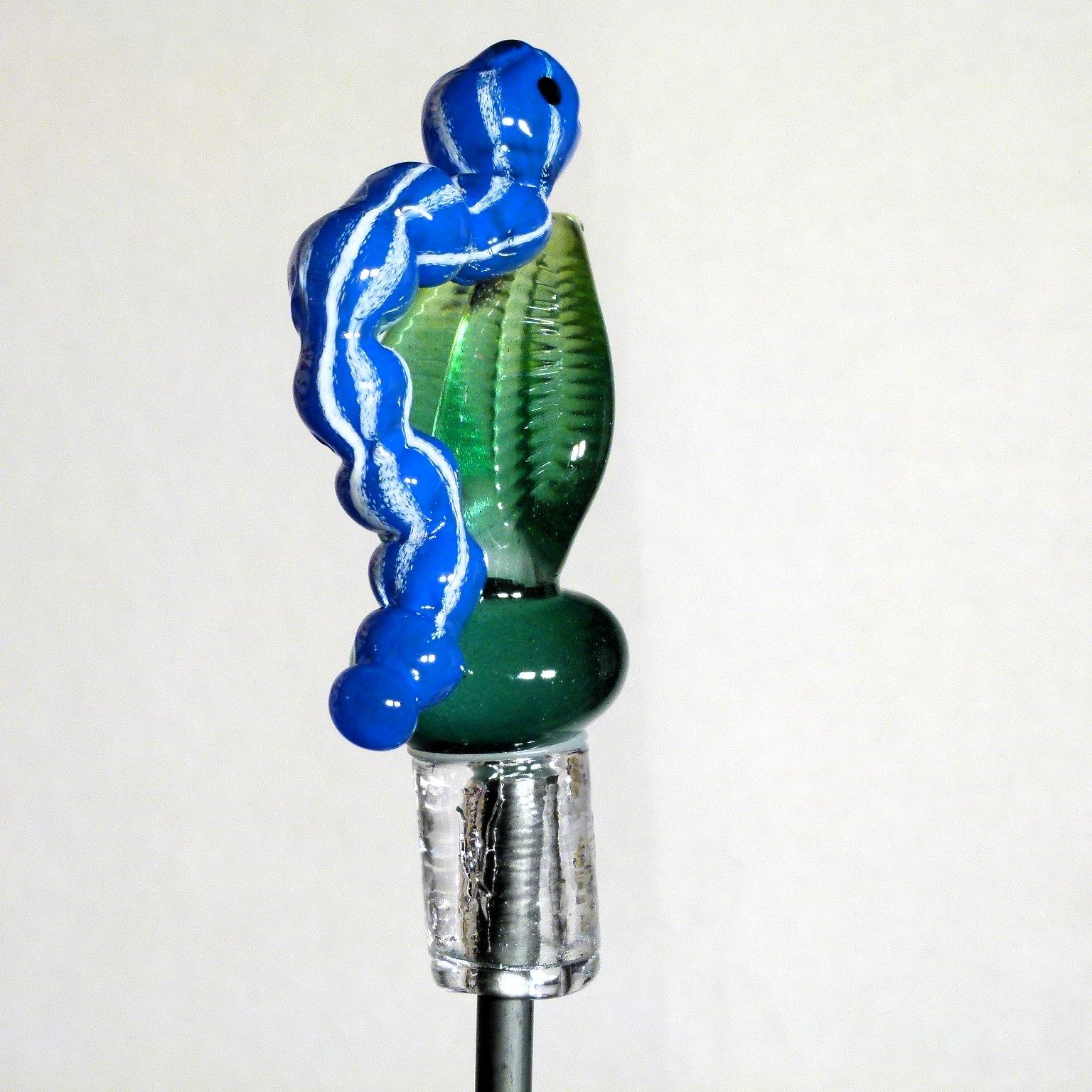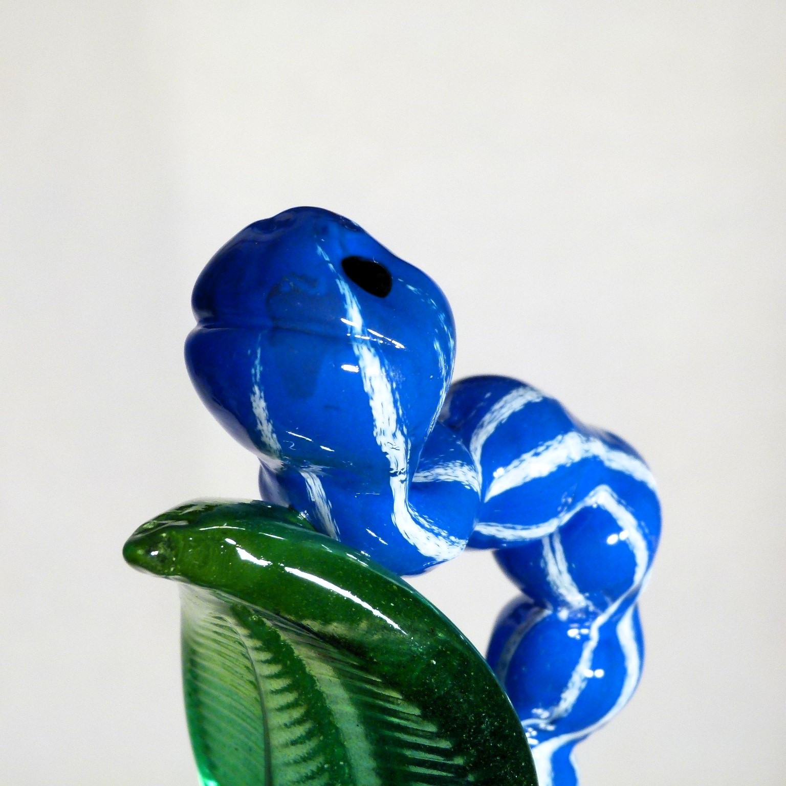 Die Raupe sitzt auf einem grünen Blatt. Ihr dicker Körper ist aus blauem Glas mit weissen Streifen. Jedes Stück ist aus Kristallglas hand geformt und ist dadurch einzigartig!