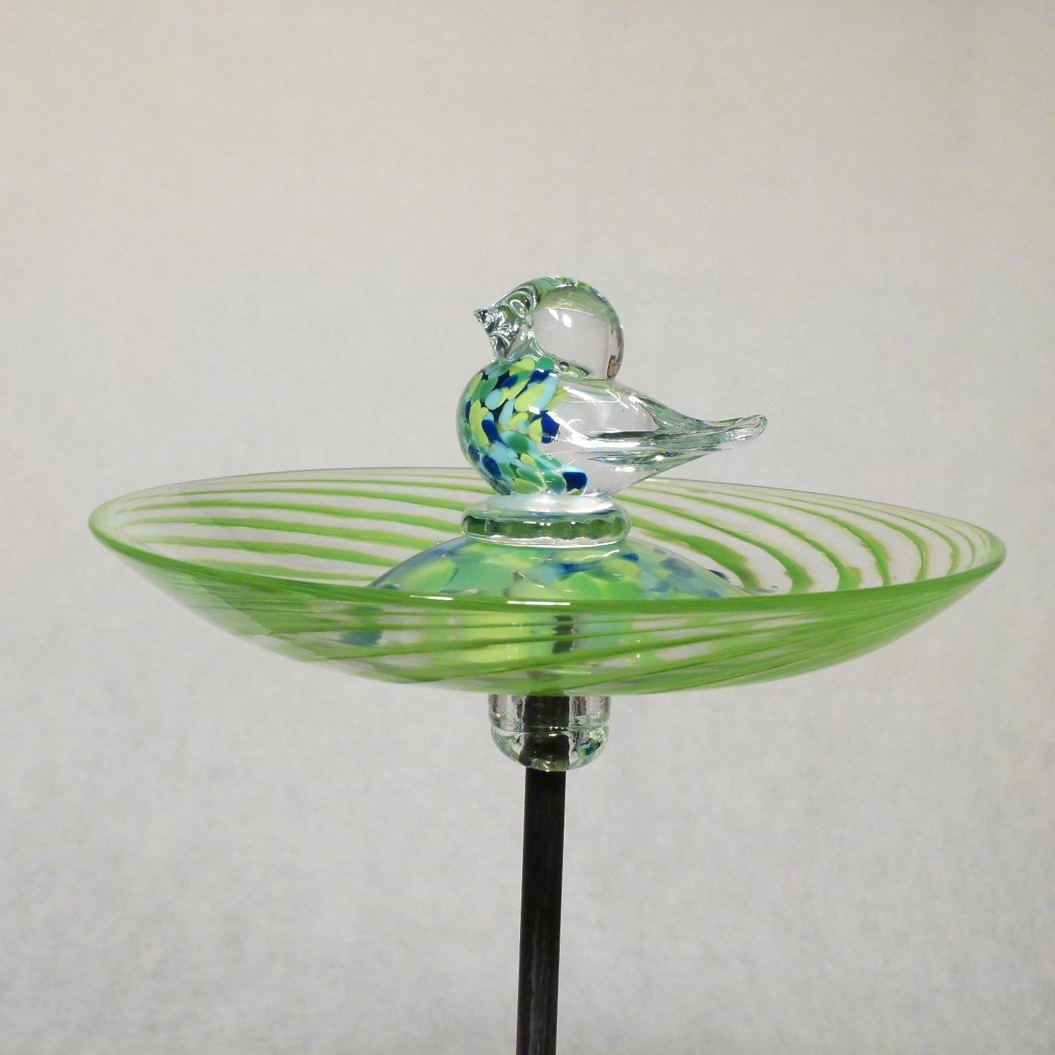 Vogelbad mit grünem Rand und blau-grünen Farben in der Mitte. Ein blau-grünes Glas-Vögelchen sitzt mittig.