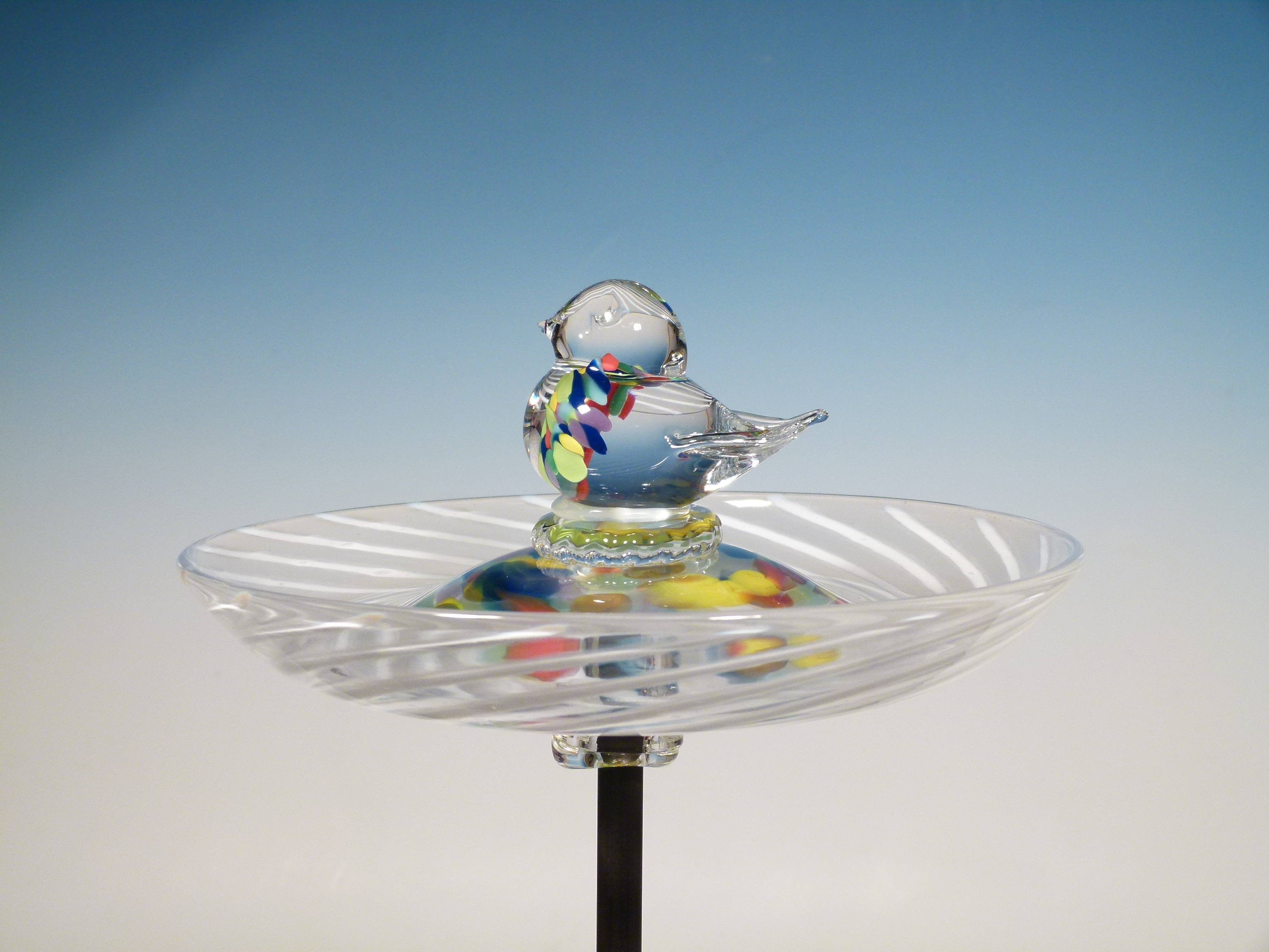 Eine Vogeltränke aus Kristallglas in weiß mit bunten Sprenkeln mittig mit Glas-dekorativem Vögelchen in der Mitte.